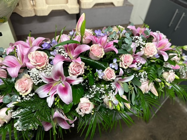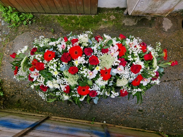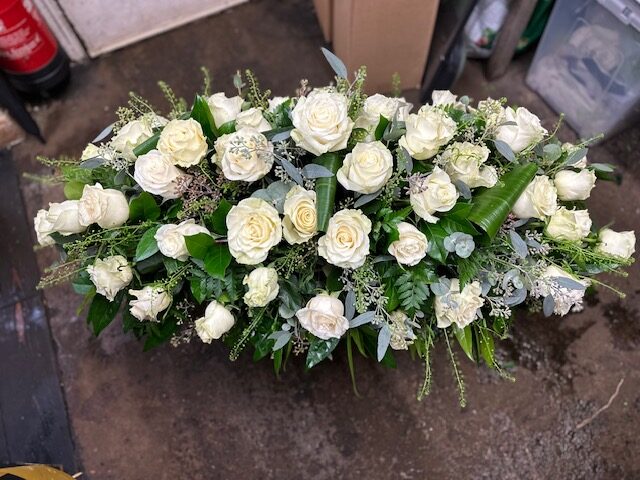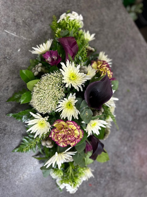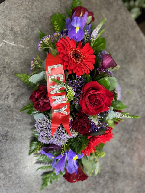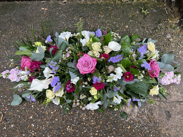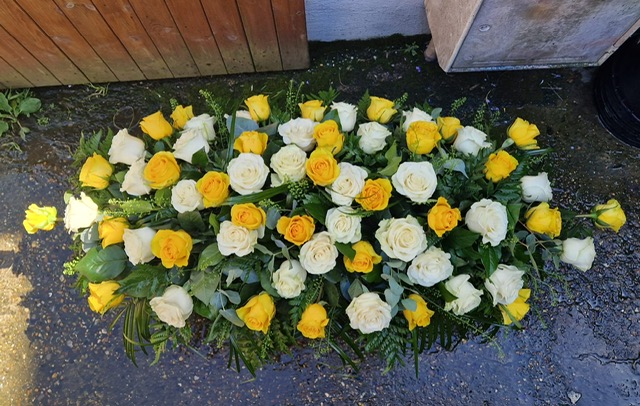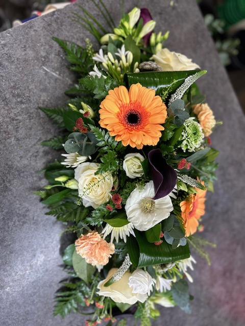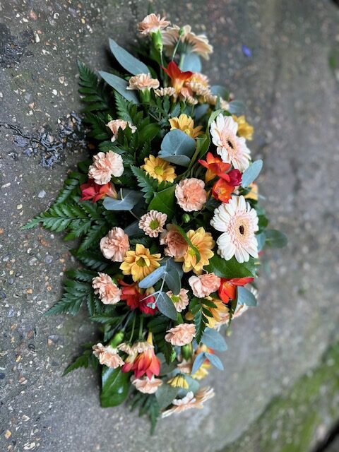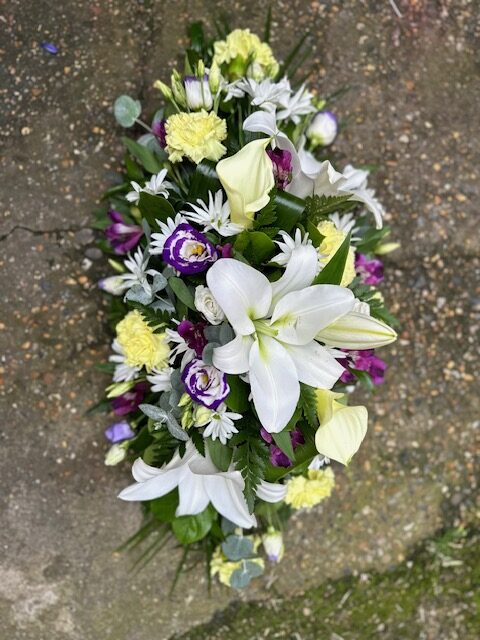 Sprays are another common funeral arrangement, often placed atop the coffin and typically ranging between 3 to 6 feet long. The choice of flowers and colours is fully customisable to your preferences, creating a beautiful tribute as they cascade down the coffin.