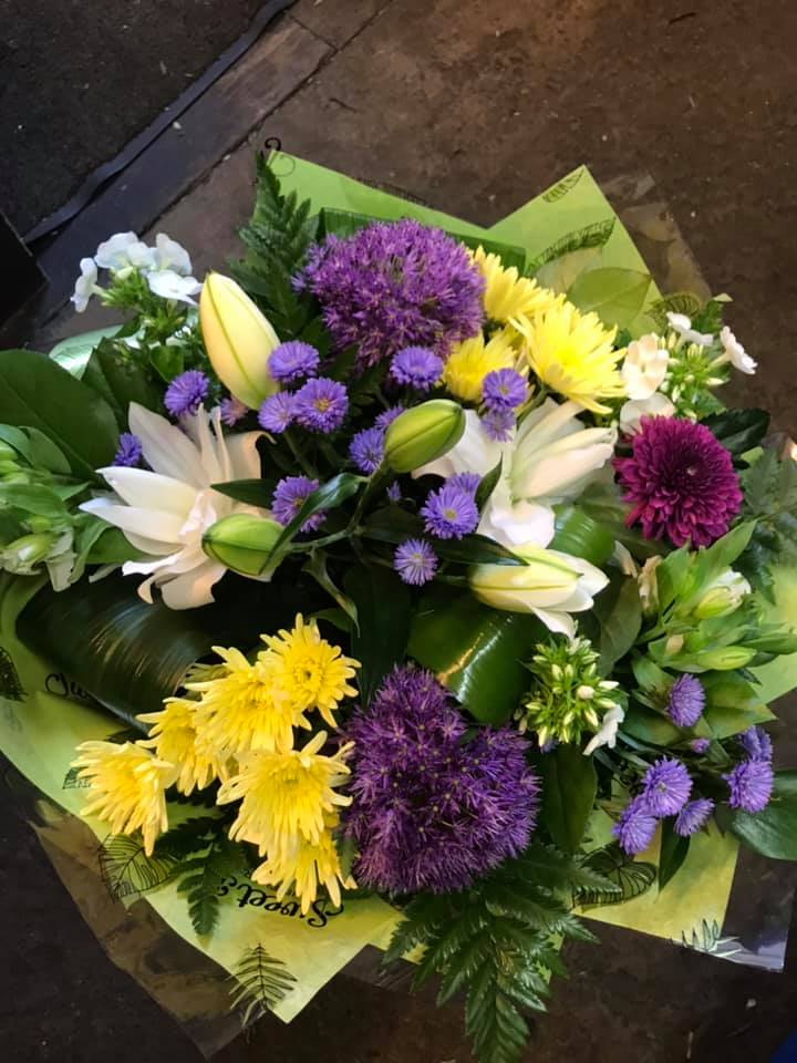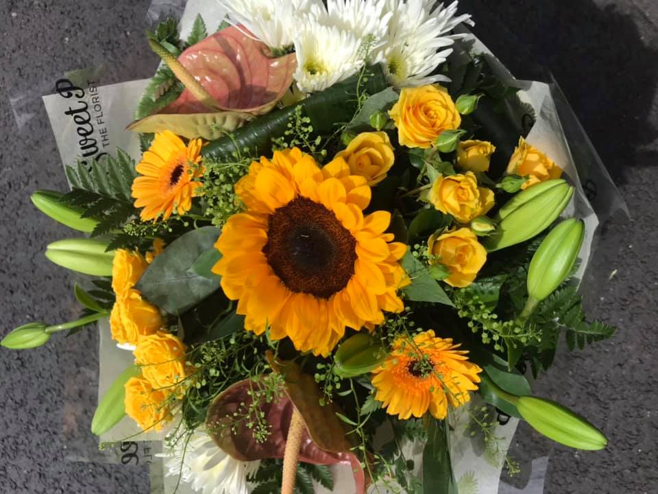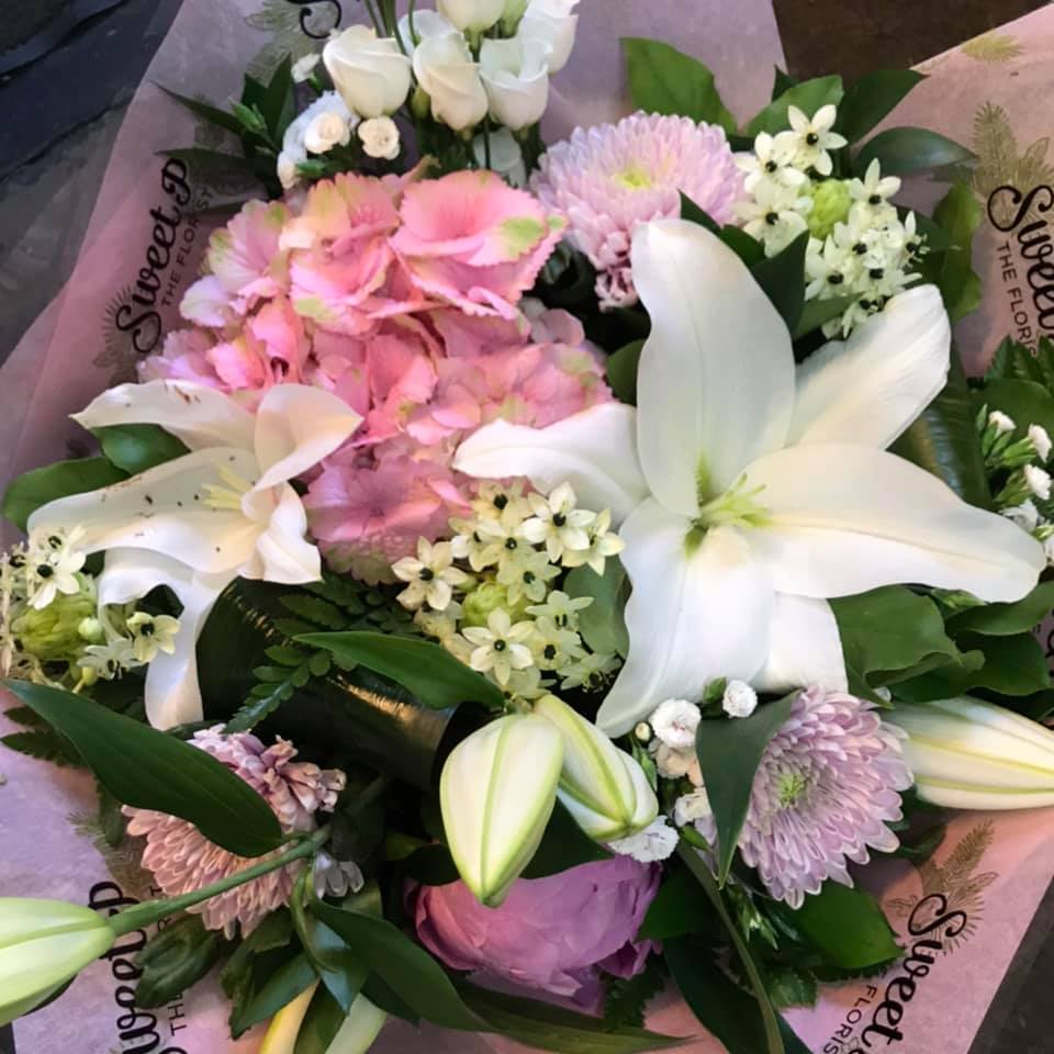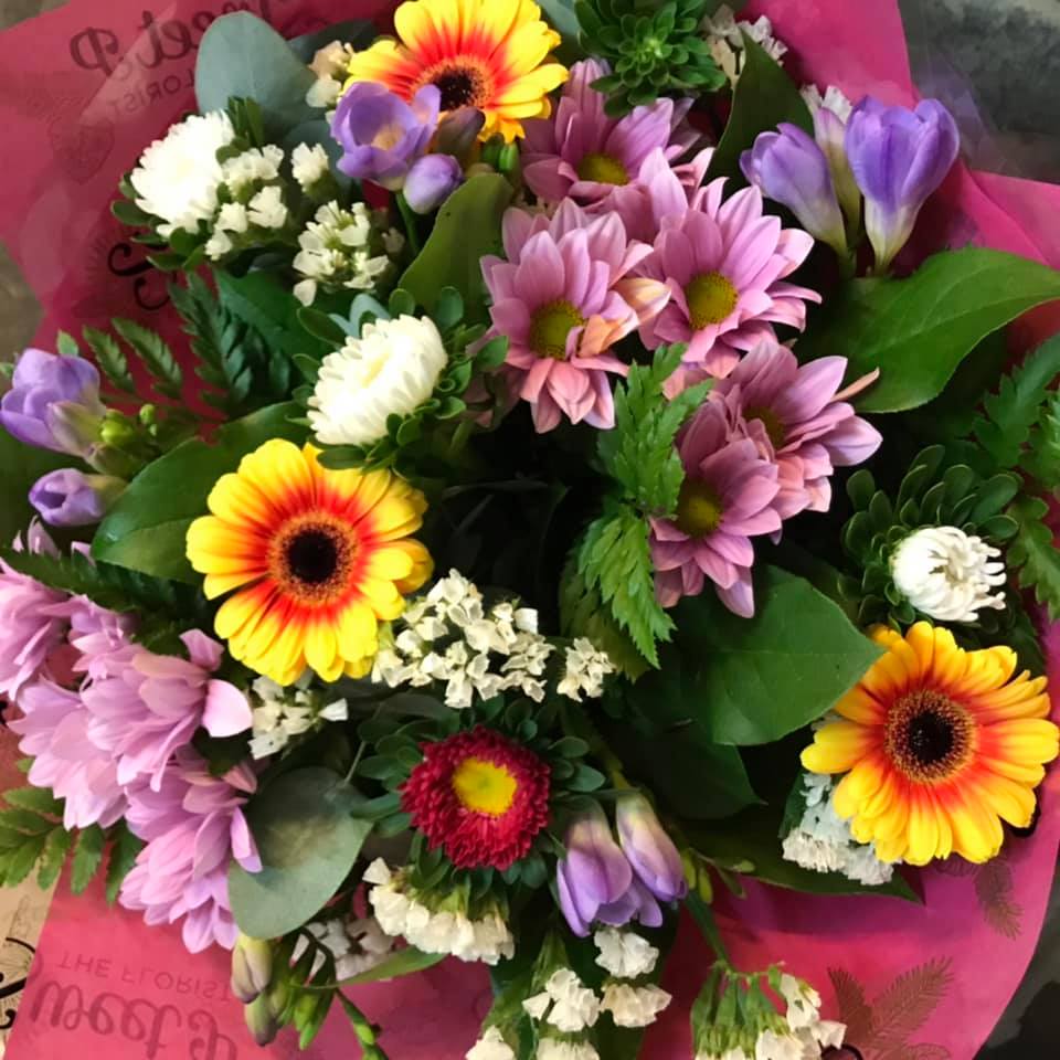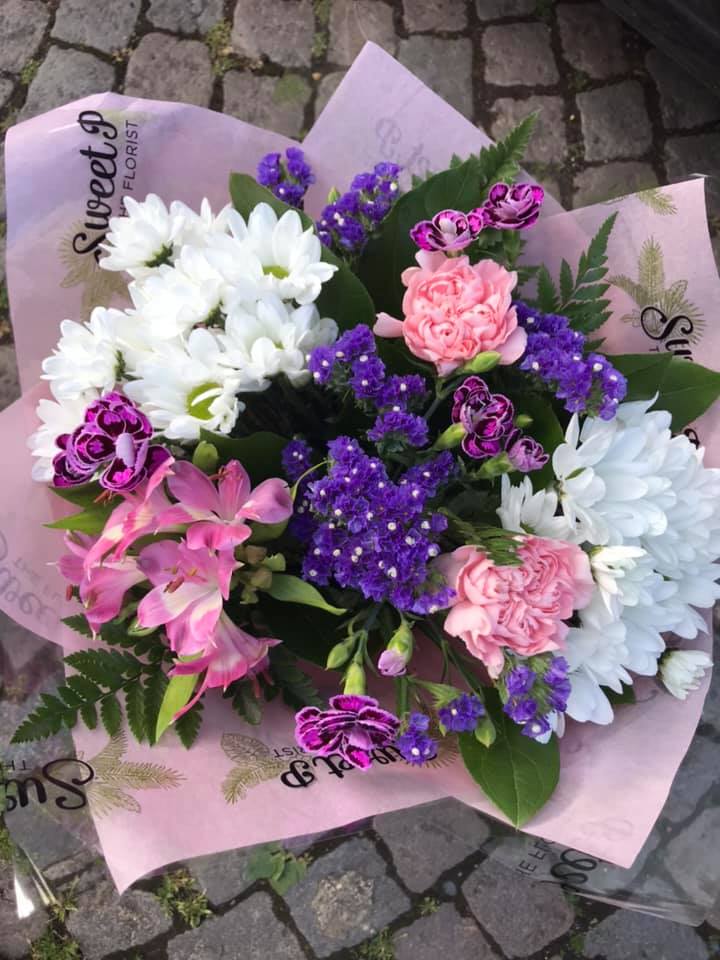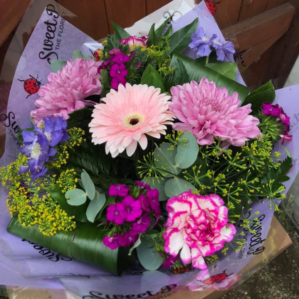 Mixed, seasonal, fresh flowers in a florist choice of colours delivered to your door by us at Sweet P. Your flowers will be arranged into a handtied bouquet gift wrapped in fresh water for you to enjoy. Please remove all packaging, recut the stems and put into a vase of fresh water after a couple of days