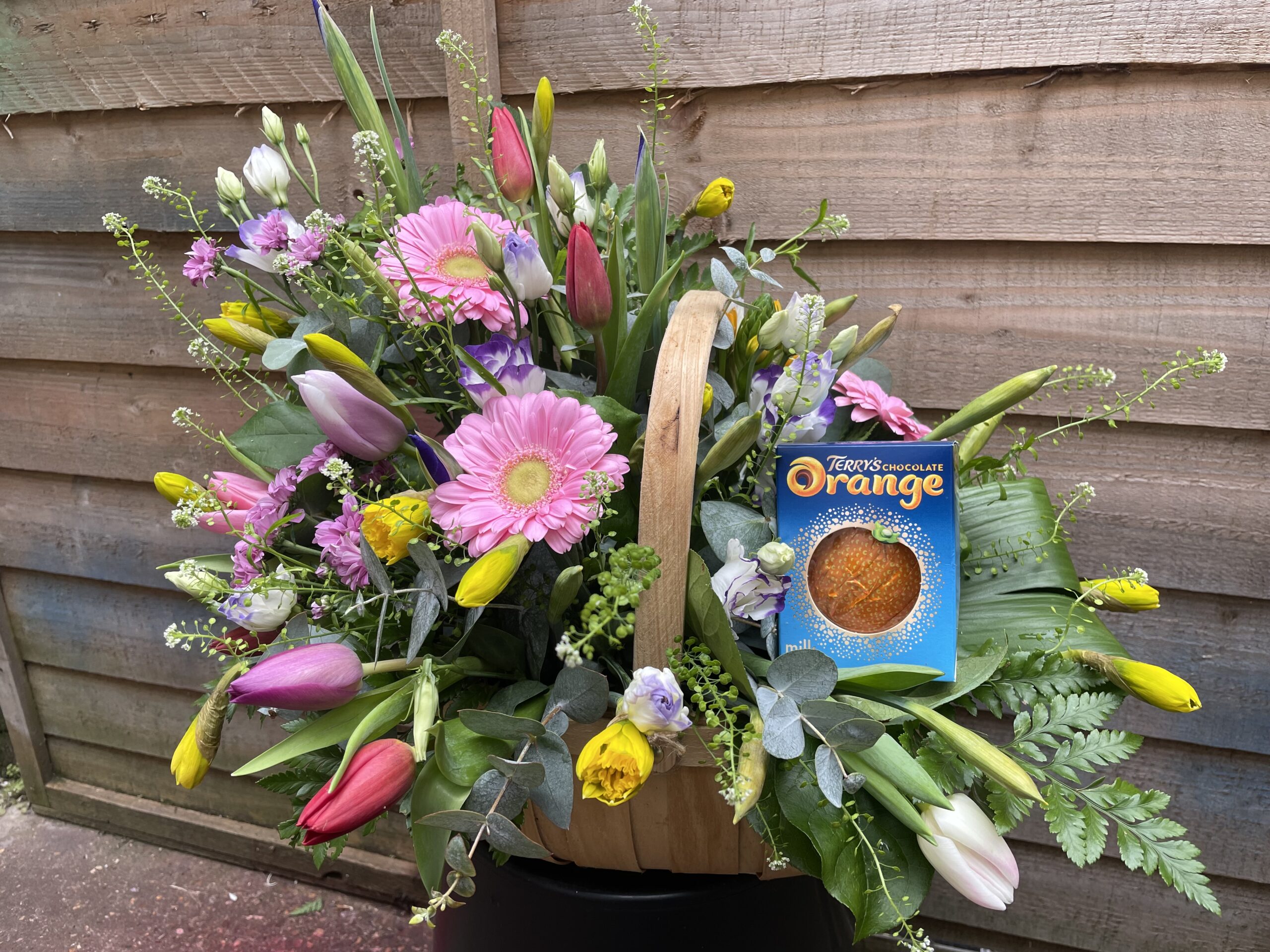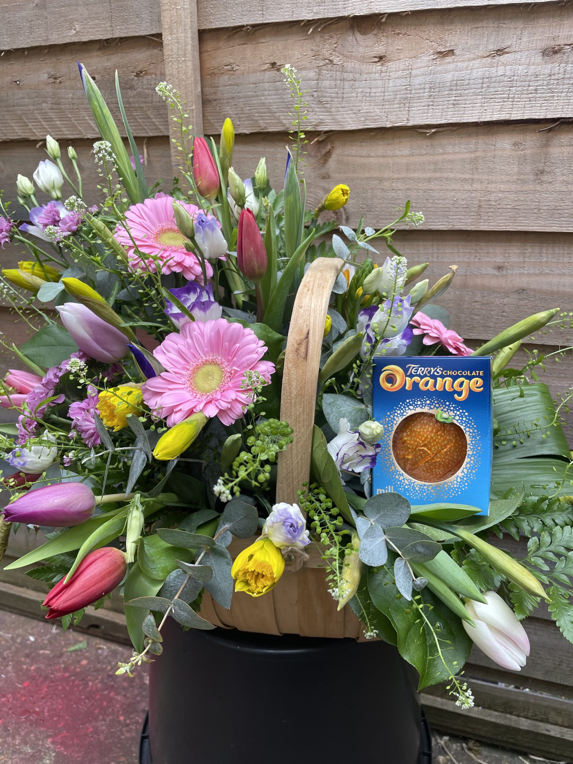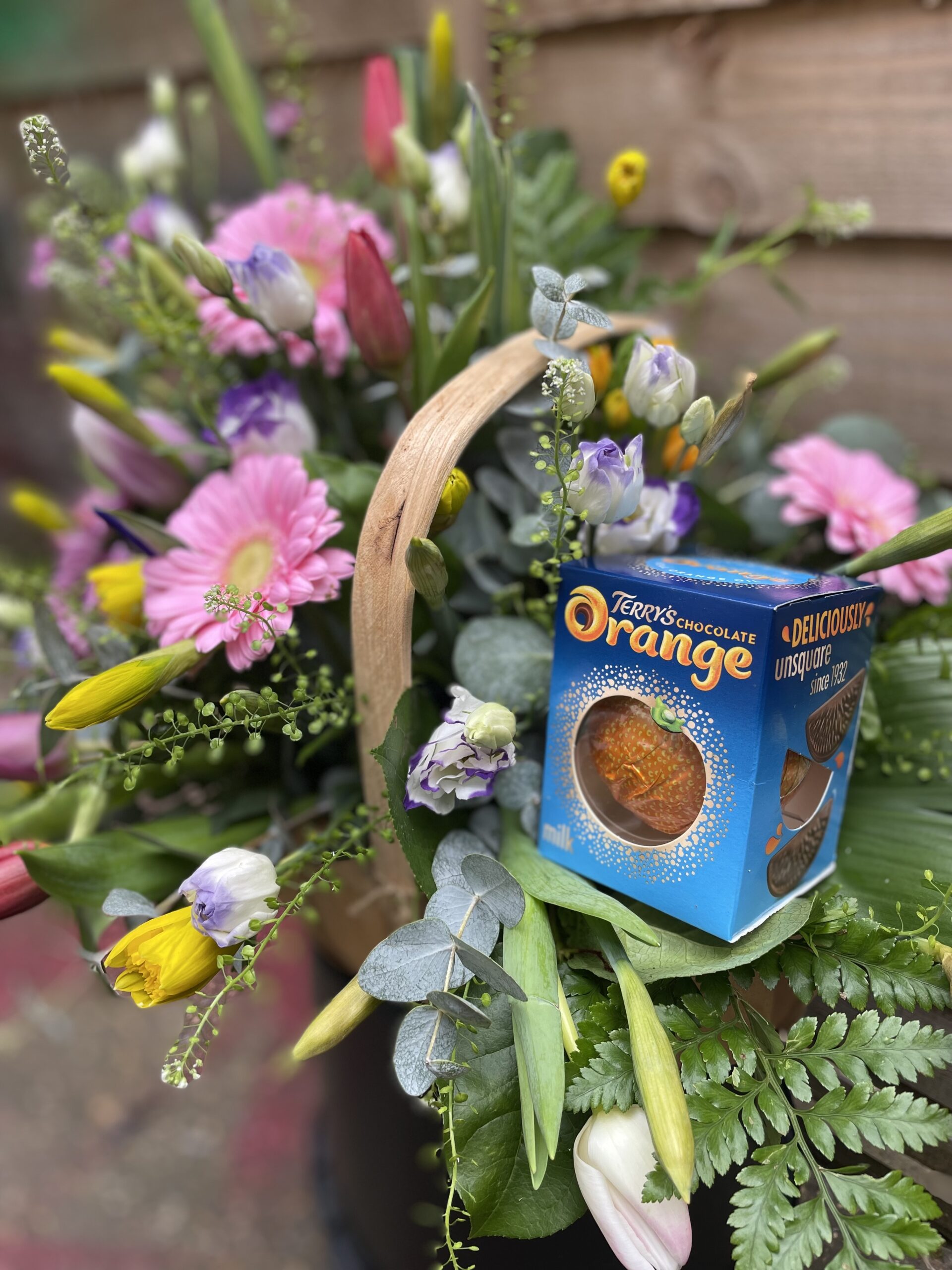 A florist choice of spring flowers, arranged in a basket with a chocolate orange nestled in the middle! YuM