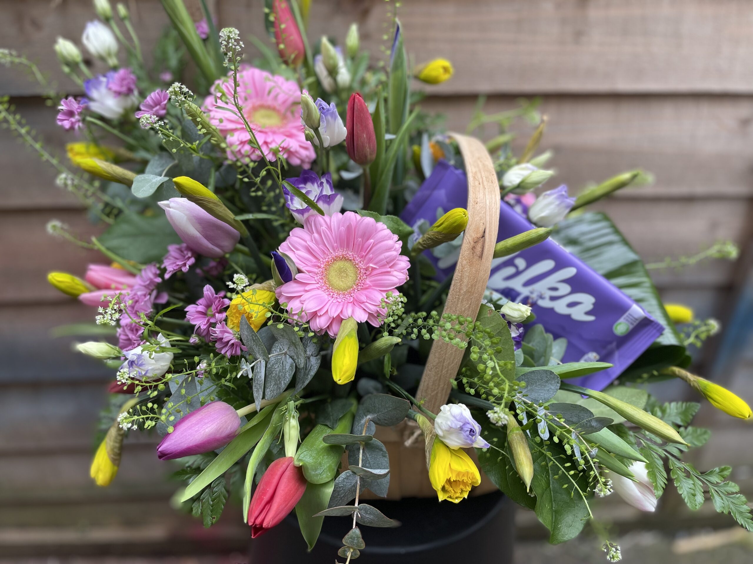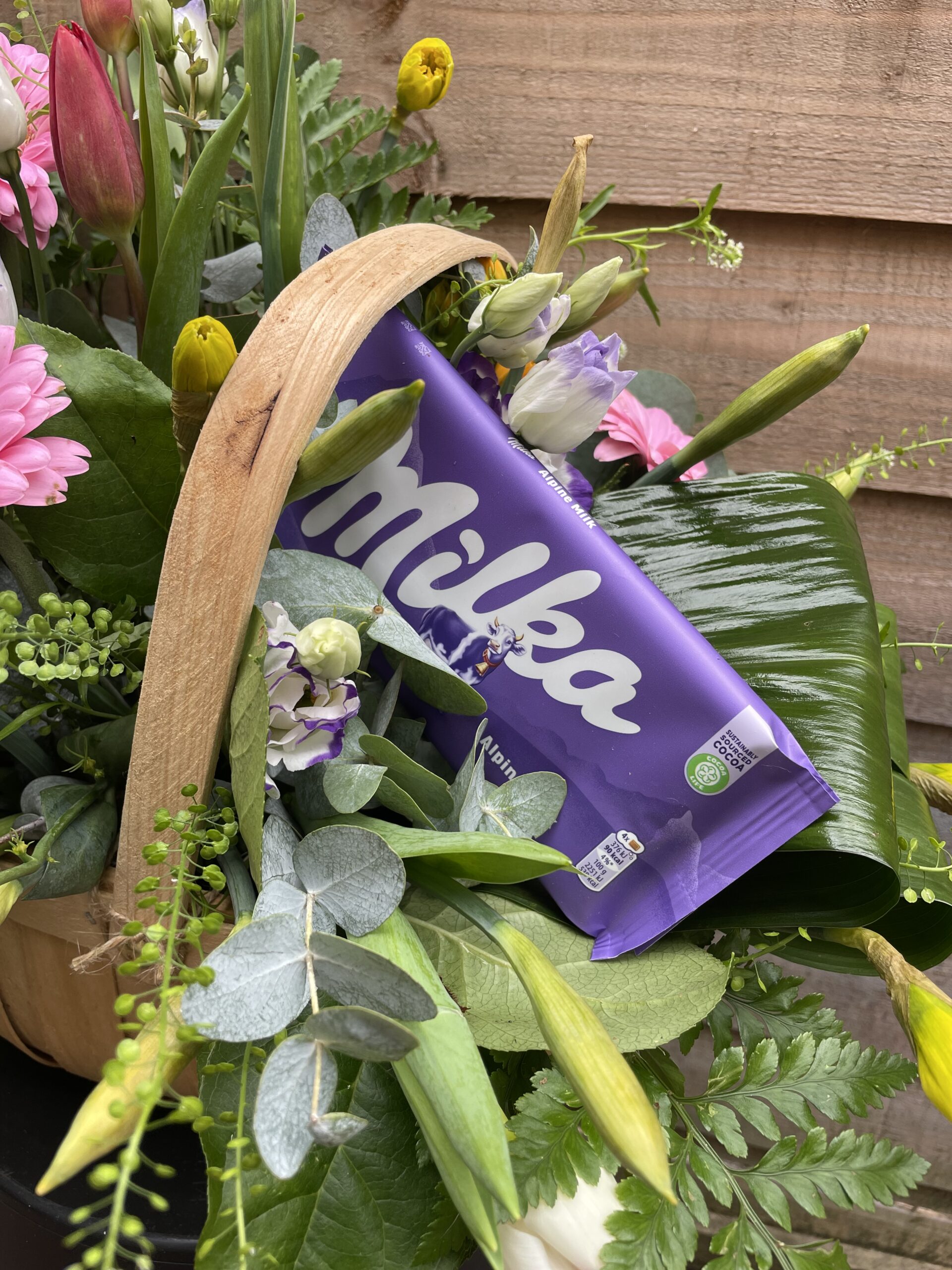 A florist choice mix of spring flowers with a cheeky bar of Milka all in one basket!