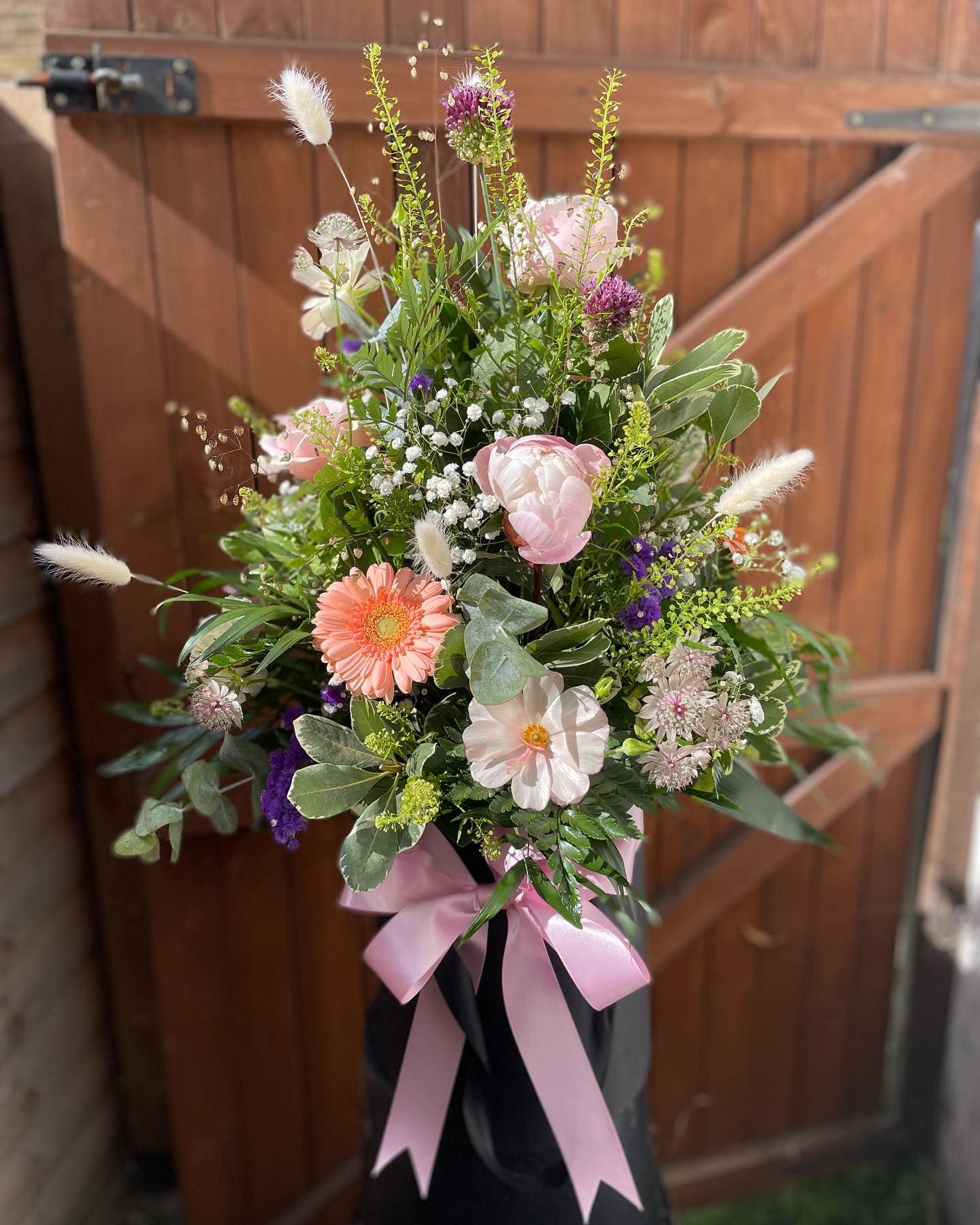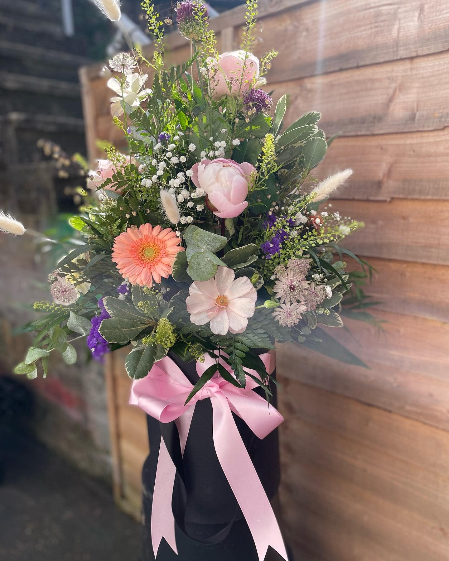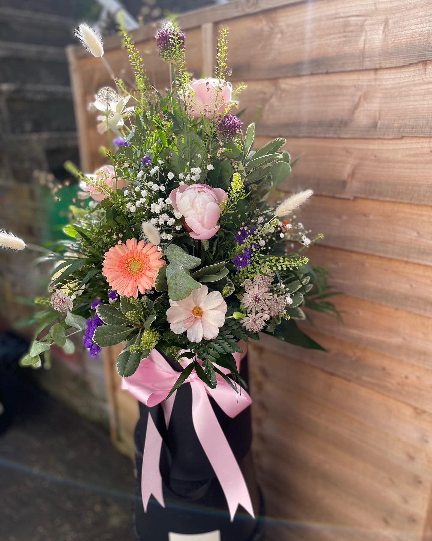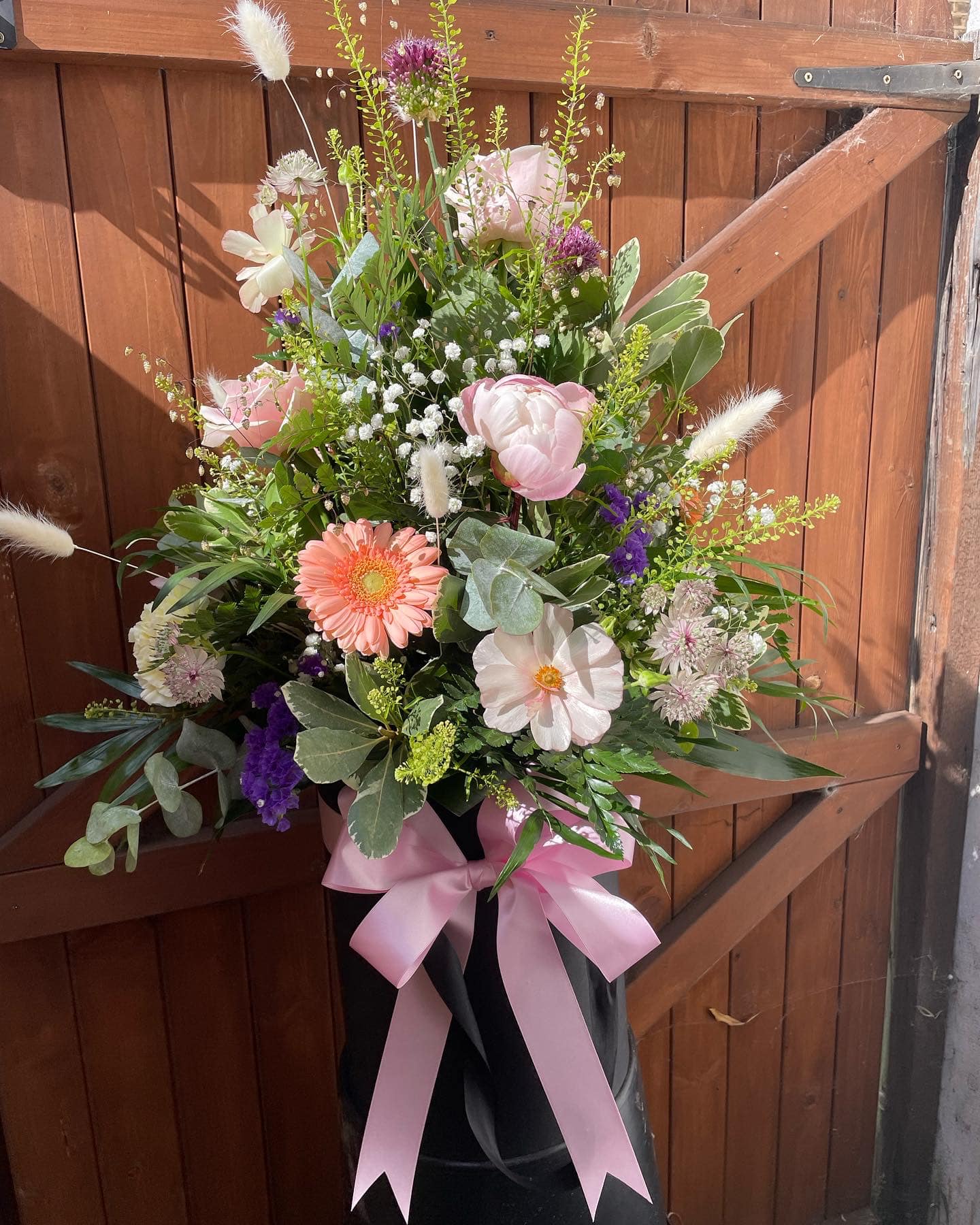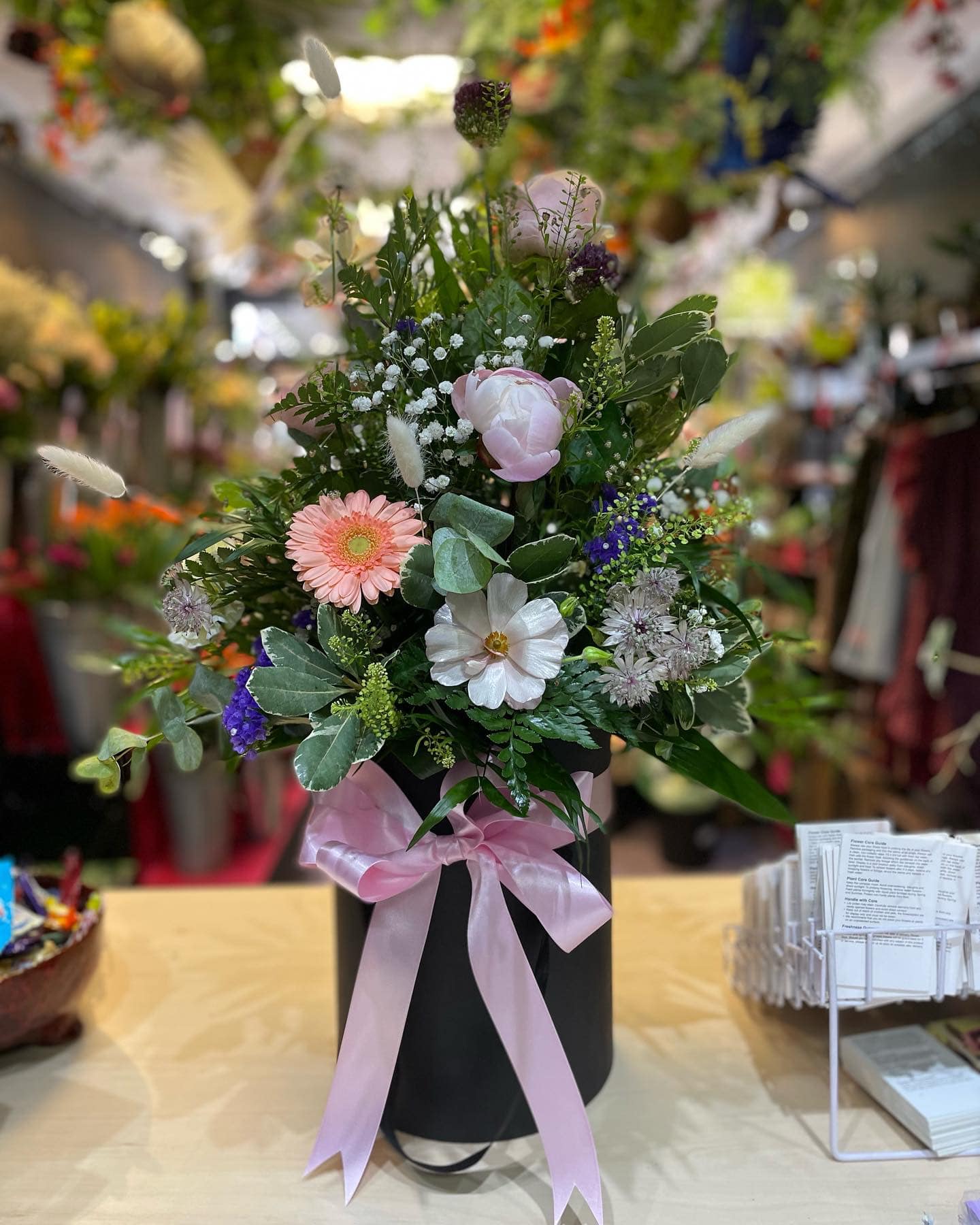 A stunning, tall hat box arrangement, created with a seasonal mixture of pastel colours, which could include creams, whites, pinks, peaches, purples, lilacs, greens. If you like something a little different, maybe this is the one for you! A defo show stopper! From a customer who recently received this gift – “thank you sooo much for these flowers, they’re absolutely beautiful bless you I cant stop crying lol, such a lovely gift made my day thank you xx”