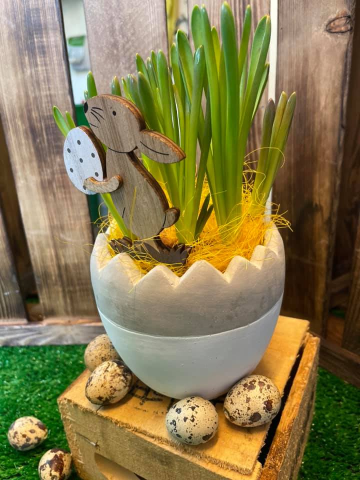 Little old Eddie Egg, a concrete egg pot with a fluffy ‘yellow yolk’ a pretty muscari plant and a cheeky rabbit to finish.