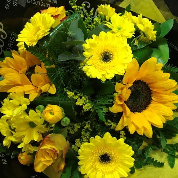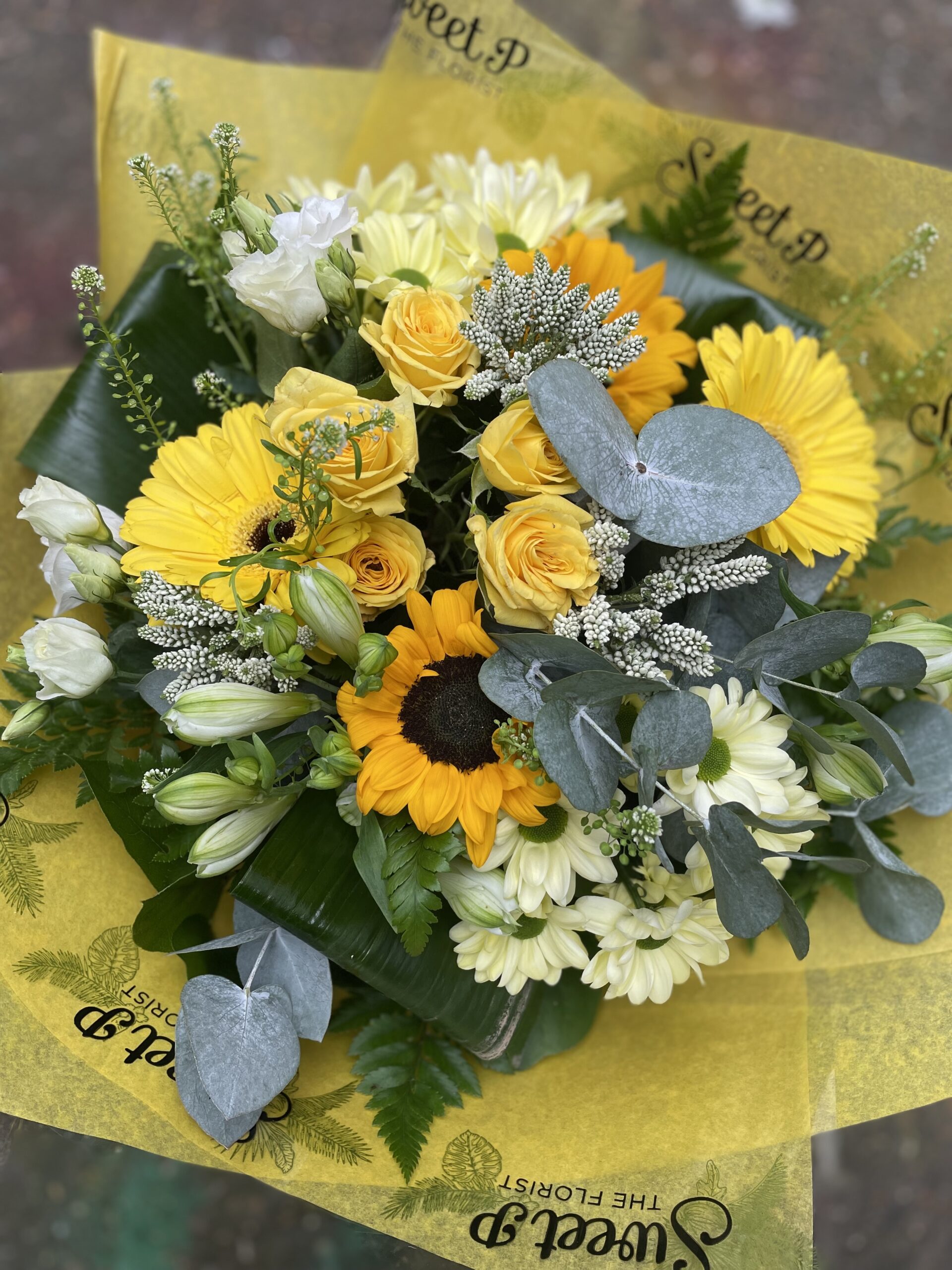 Elaine – a mixture of the finest stems in white and yellow shades picked out by our talented florists, and made into a beautiful handtied bouquet in water and displayed in a box Elaine