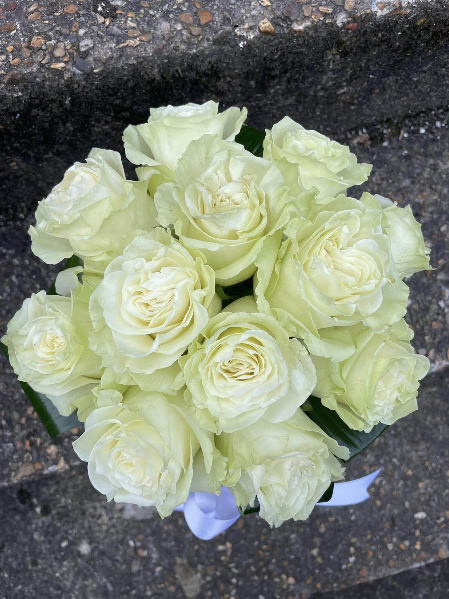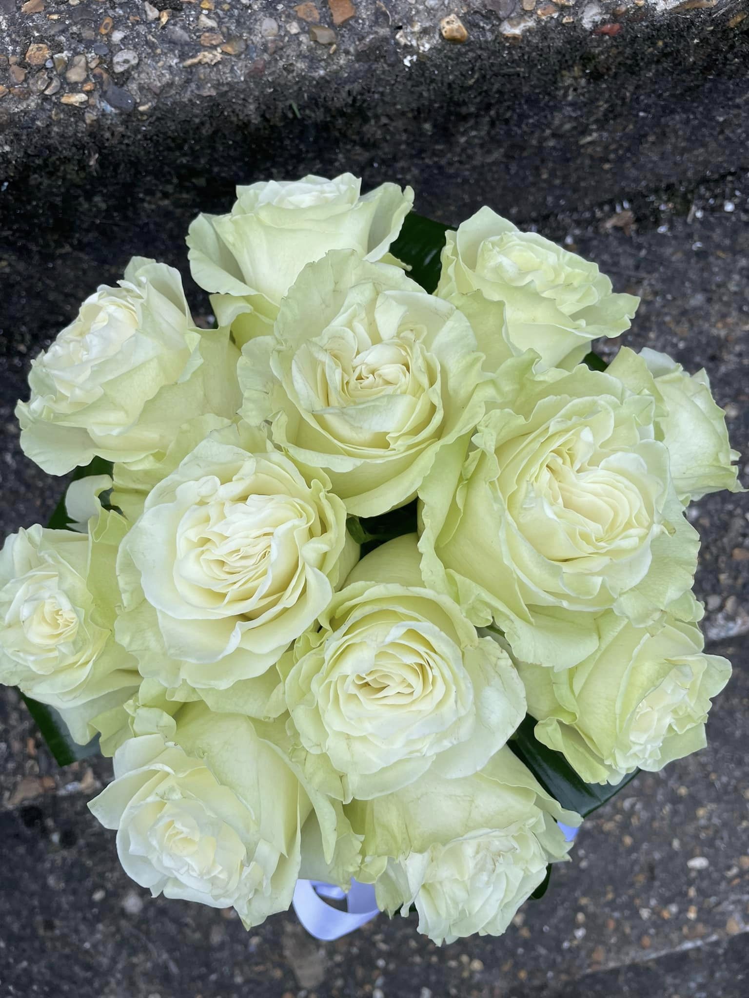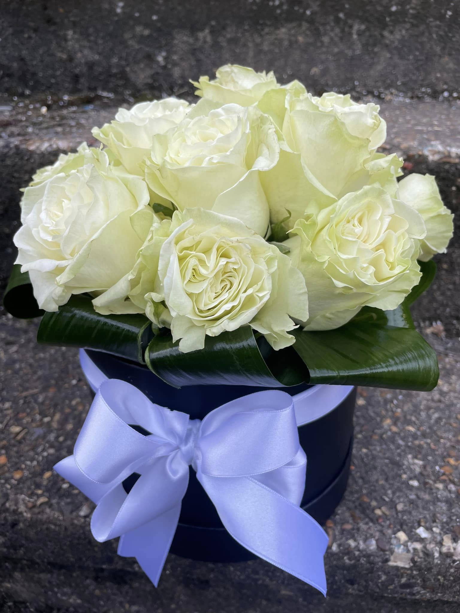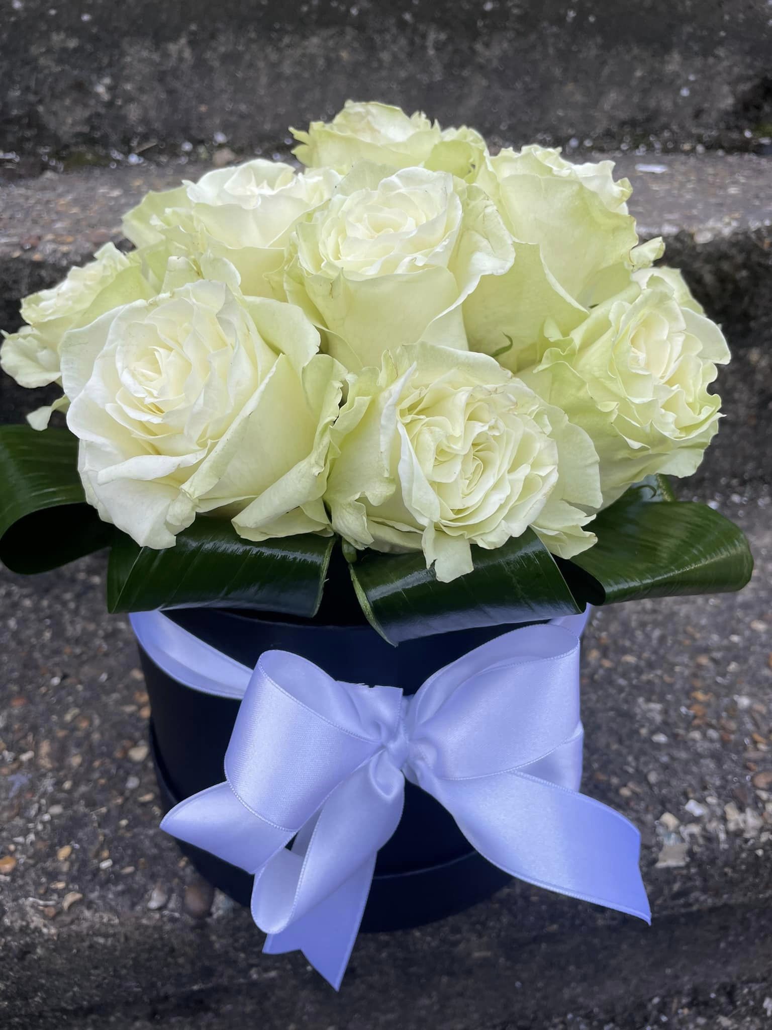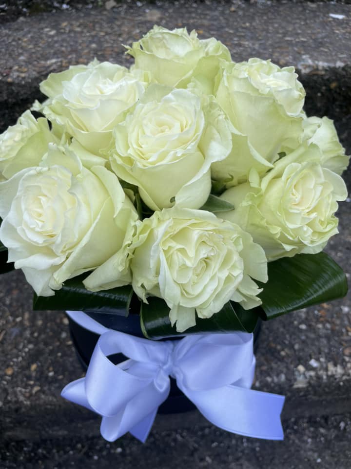 Between 9 and 12 gorgeous white roses, nestled inside this stunning hat box with diamantes snuggled in between. An elegant, compact gift. Ecuadorian roses are pictured; they are a very long lasting large headed rose. We will always try to source these roses, but a replacement will be made with a different rose species without notification if they cannot be sourced.