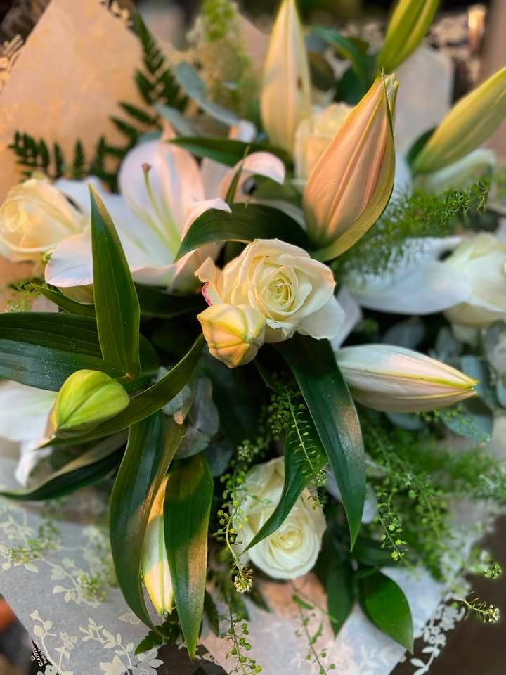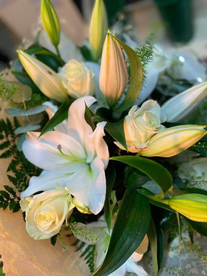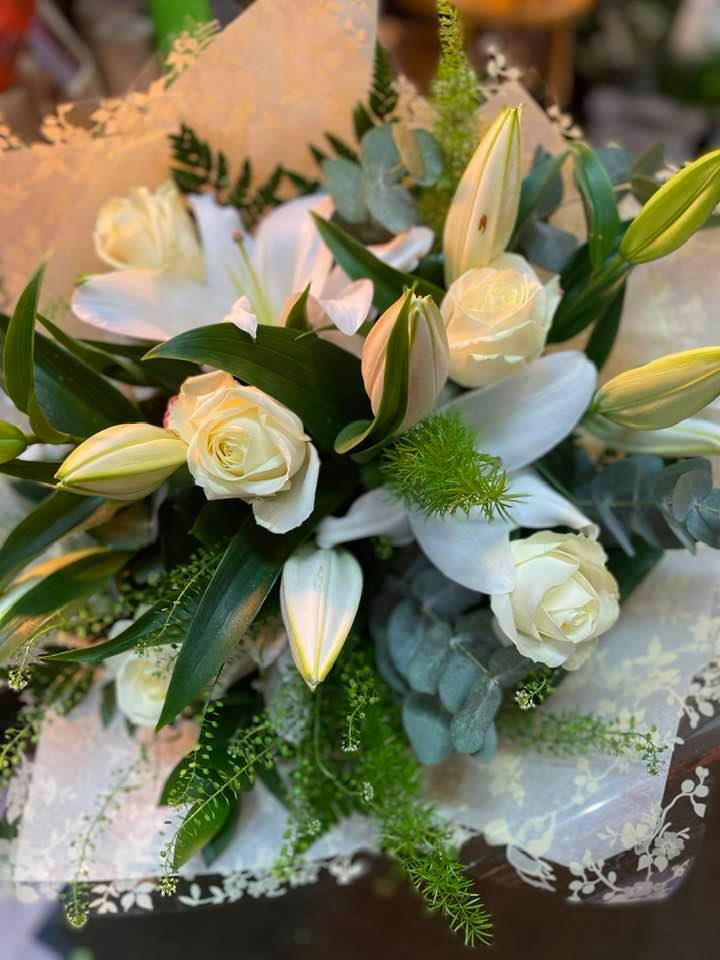a mix of white lilies, white roses, eucalyptus and a mixture of greenery to make a stunning bouquet. Medium is pictured here, 5 roses and 3 lilies. please note lilies may arrive in bud so bouquet may look smaller than image – but they will open! 🙂