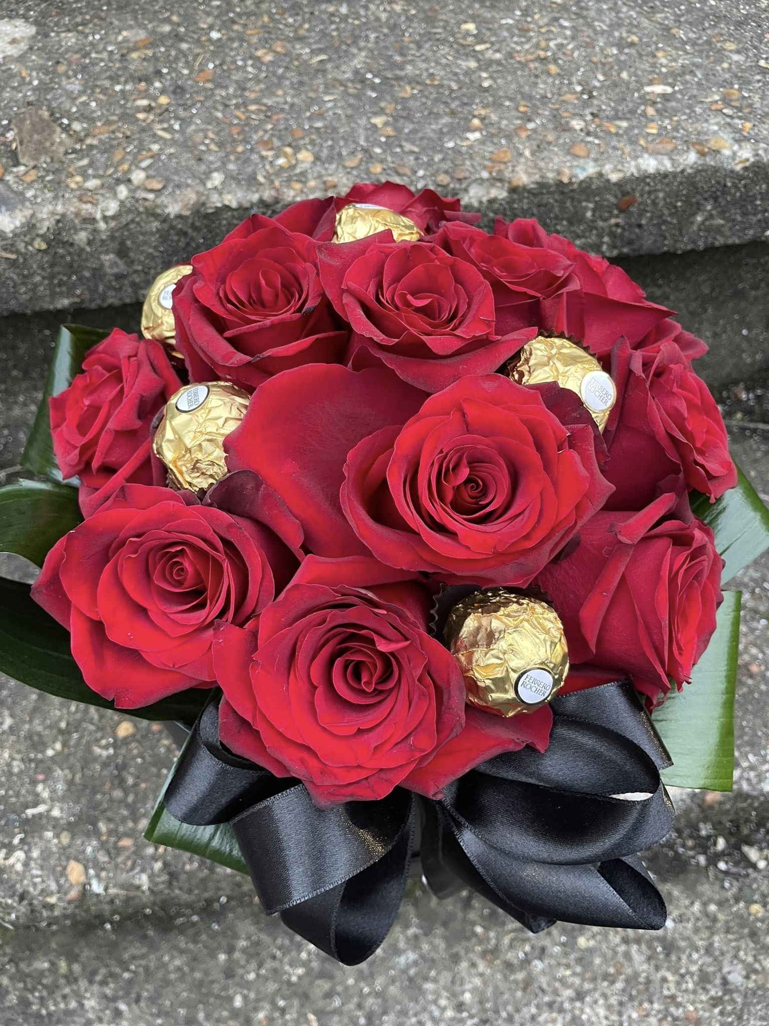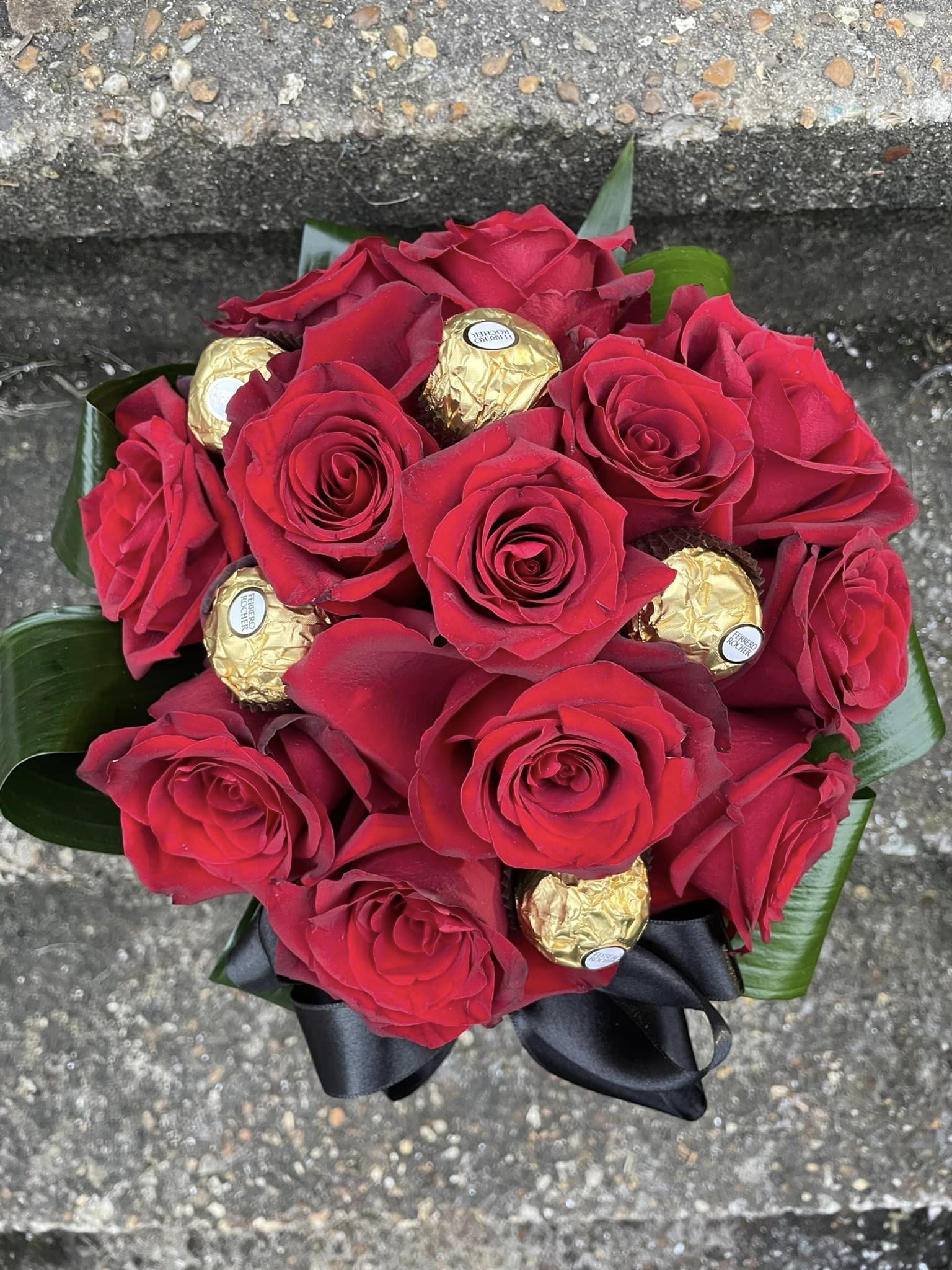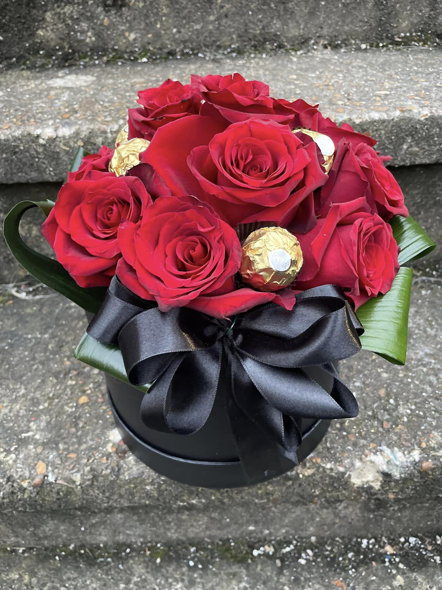 (12 red rose in a hat box with 6 Ferrero Roche)