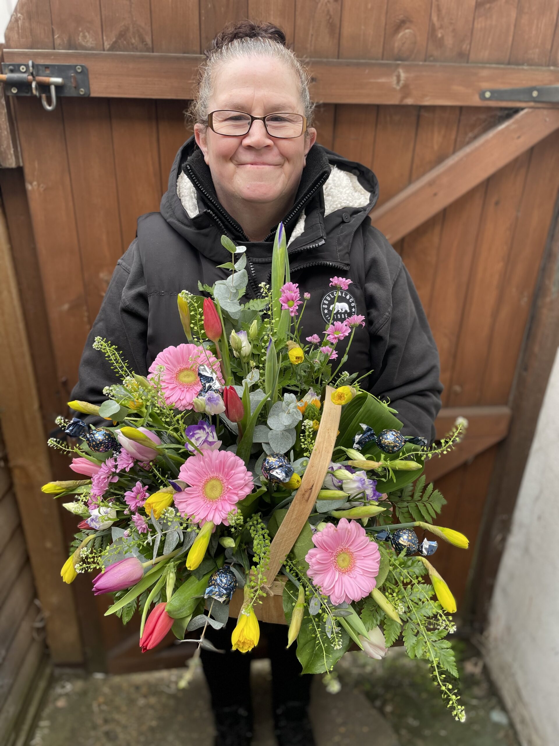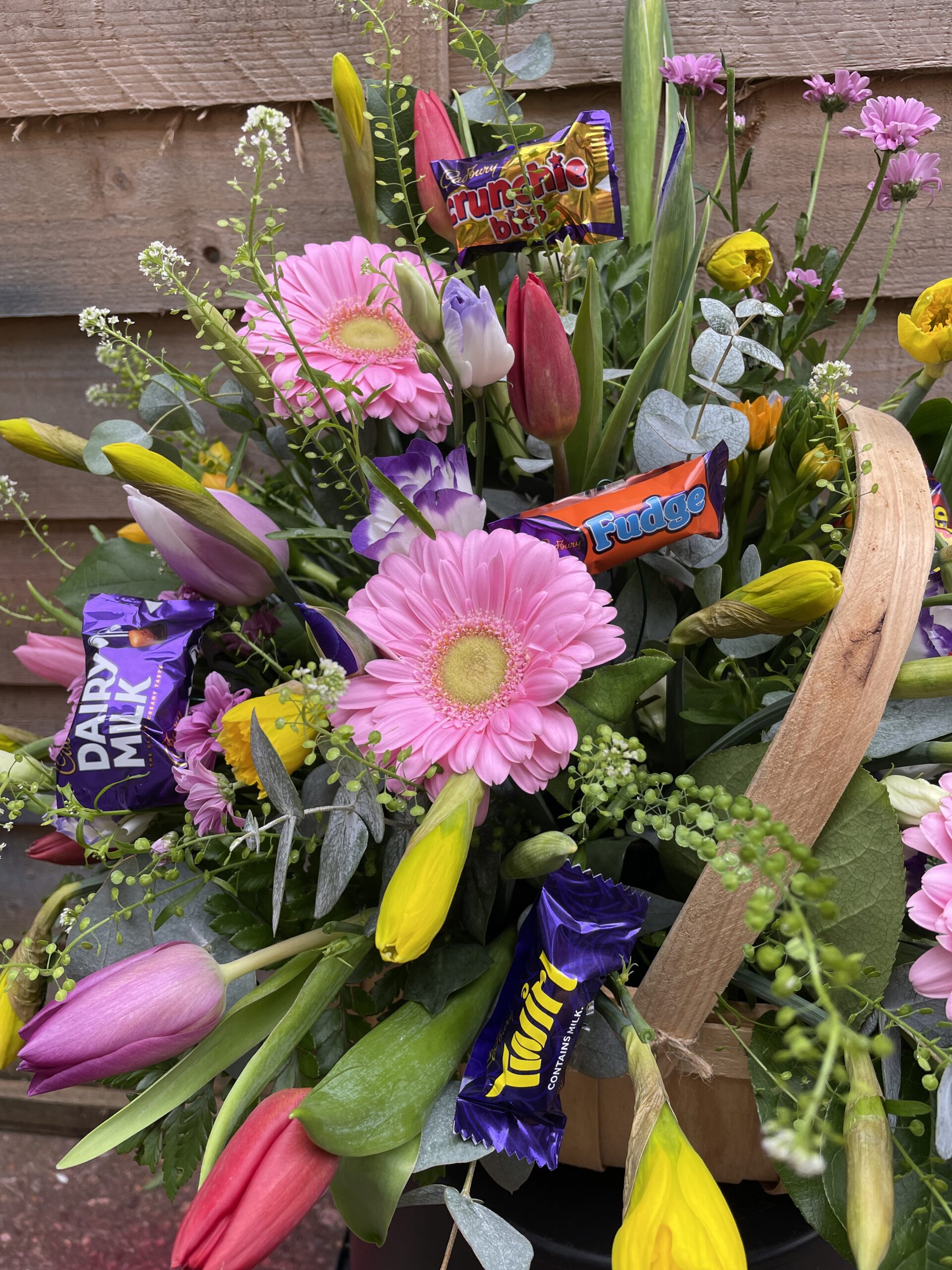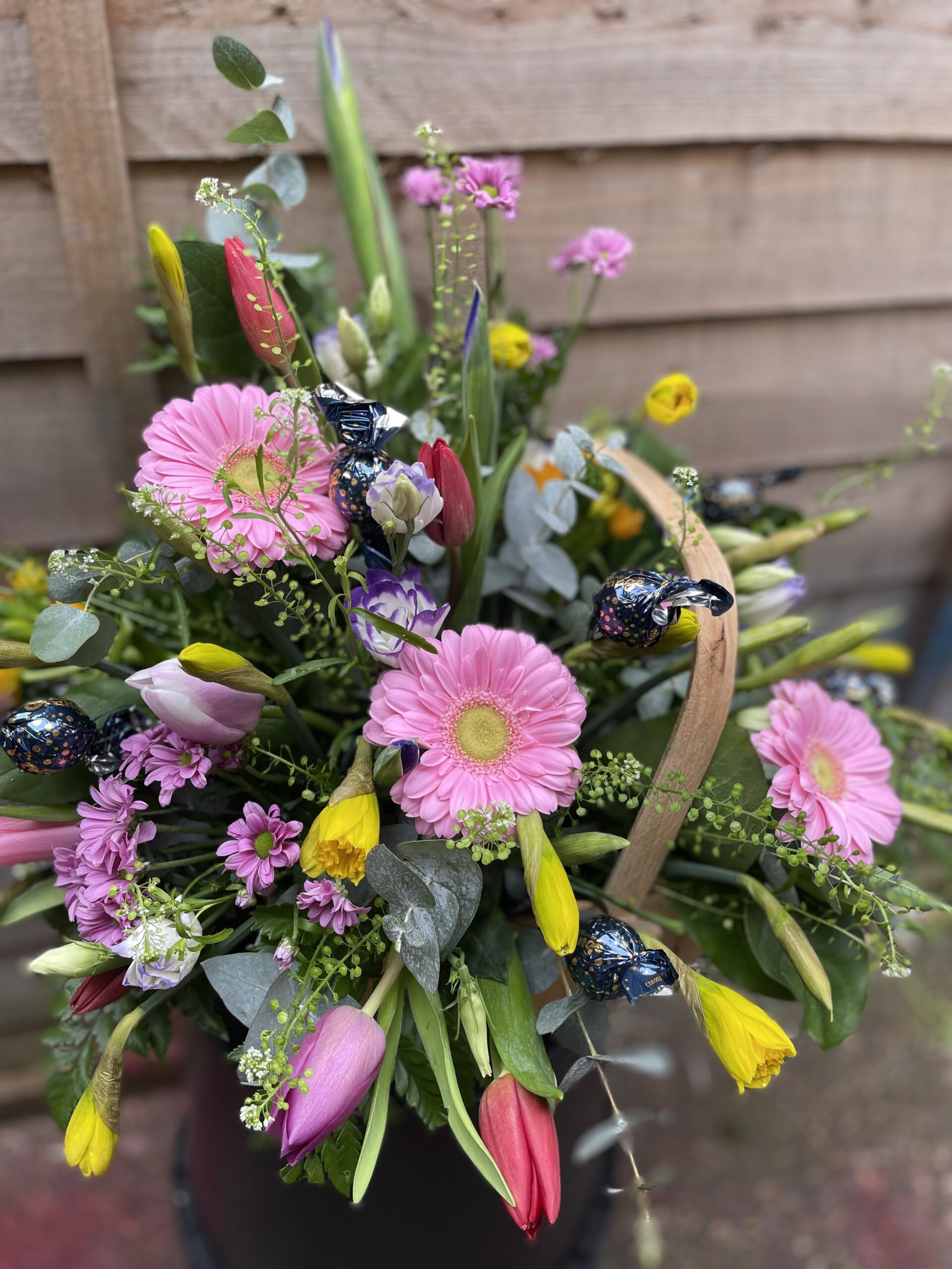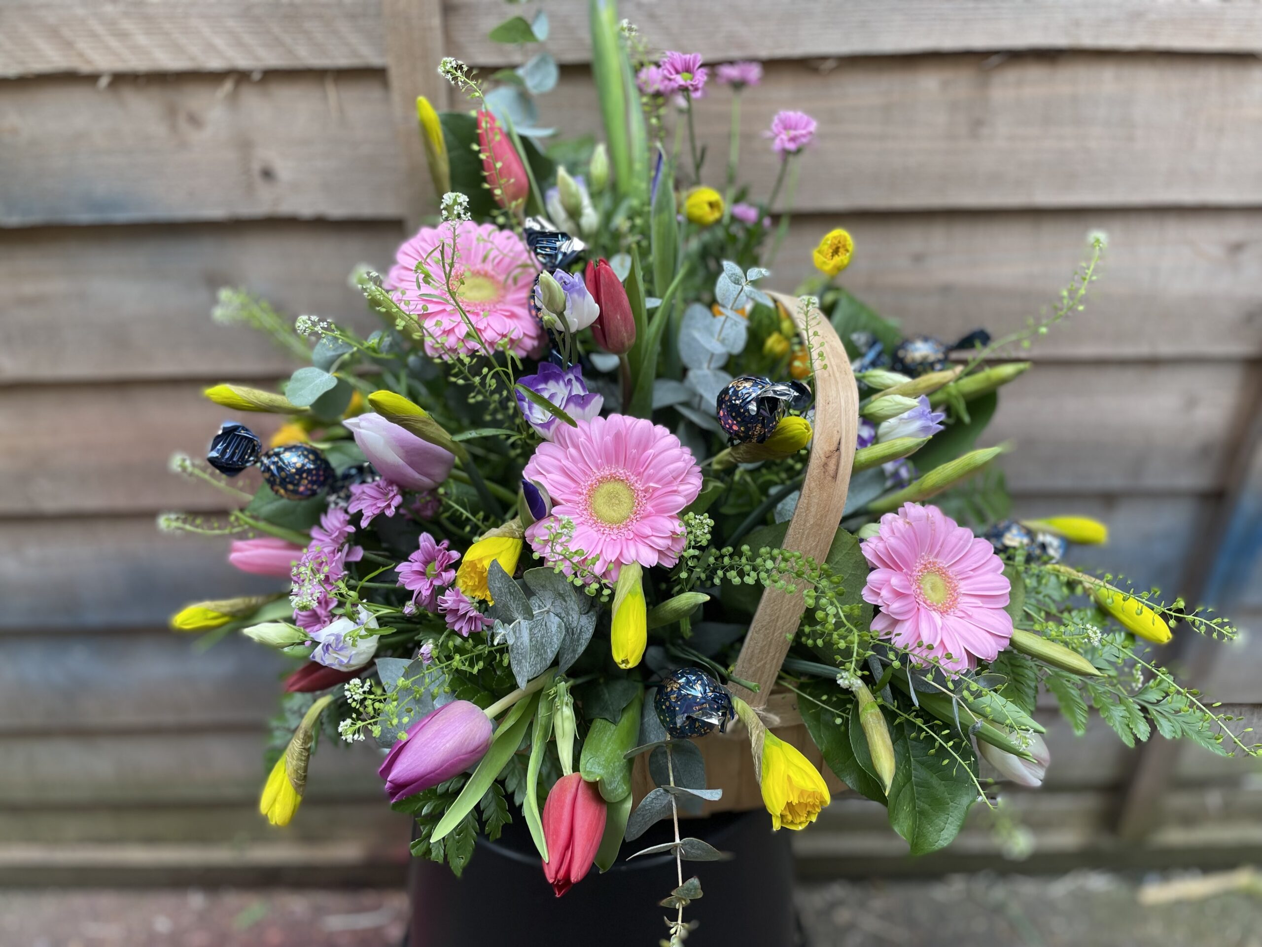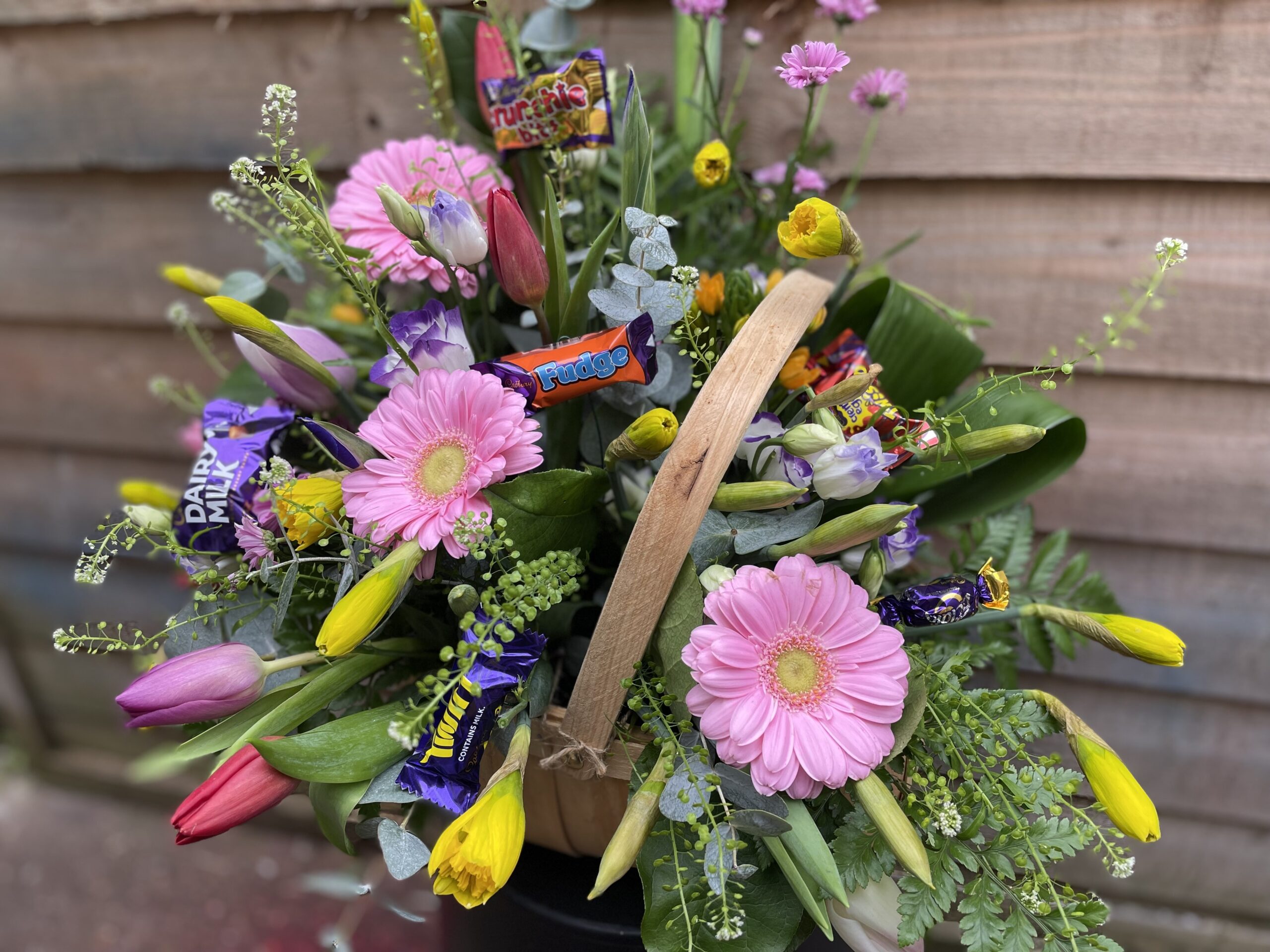 a fabulous basket of mixed spring flowers with chocolates nestled in between! Lush
