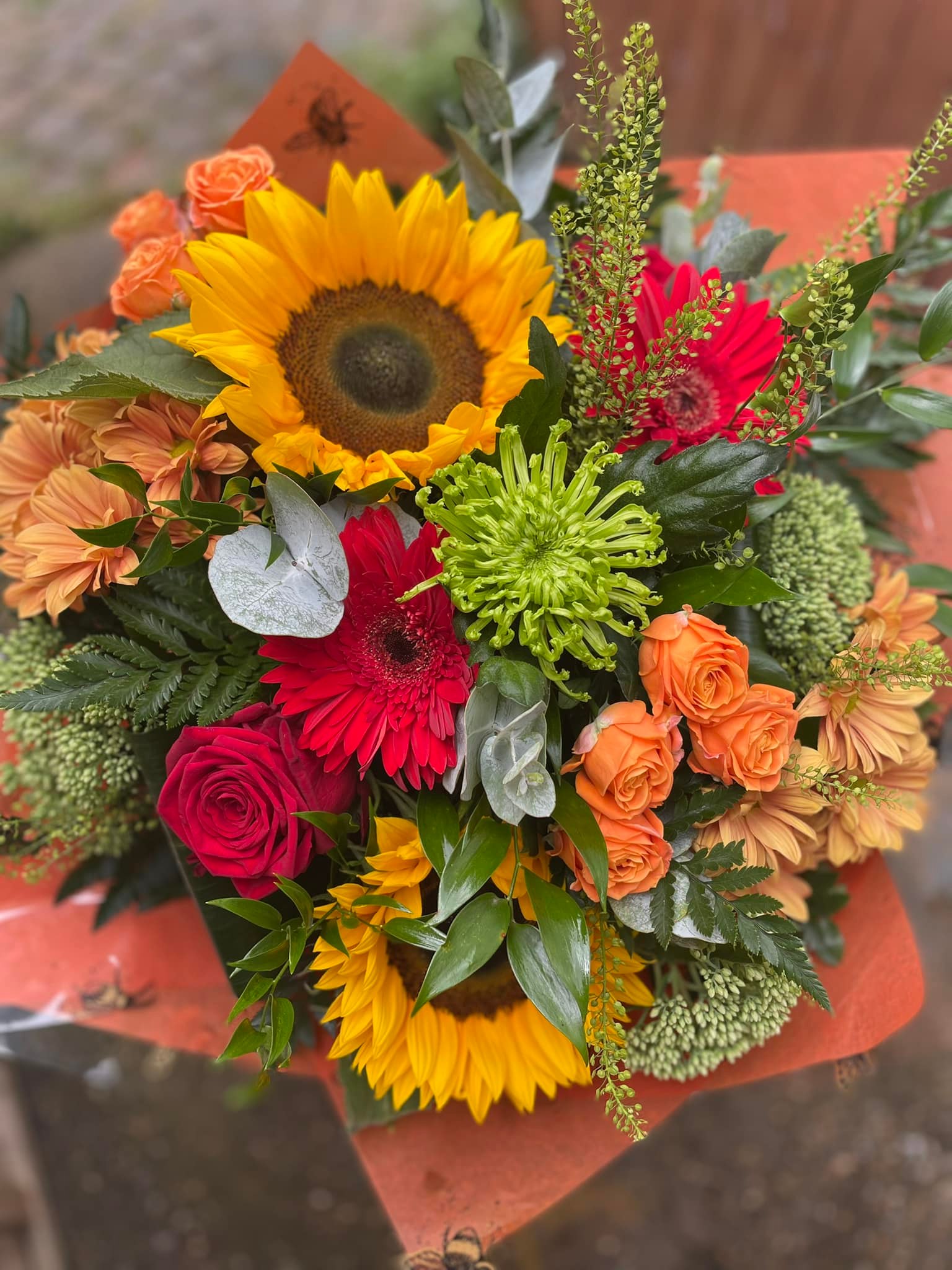Molly – a mixture of the finest stems in red orange and green white colours picked out by our talented florists, and made into a beautiful handtied bouquet in water and displayed in a box