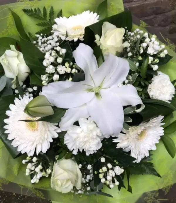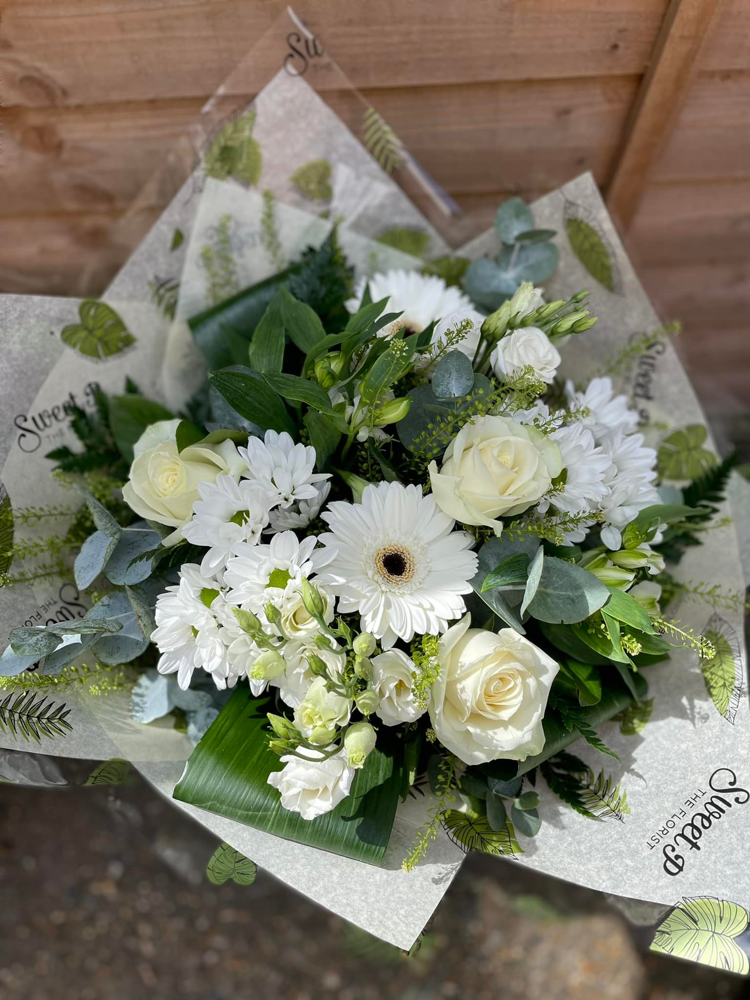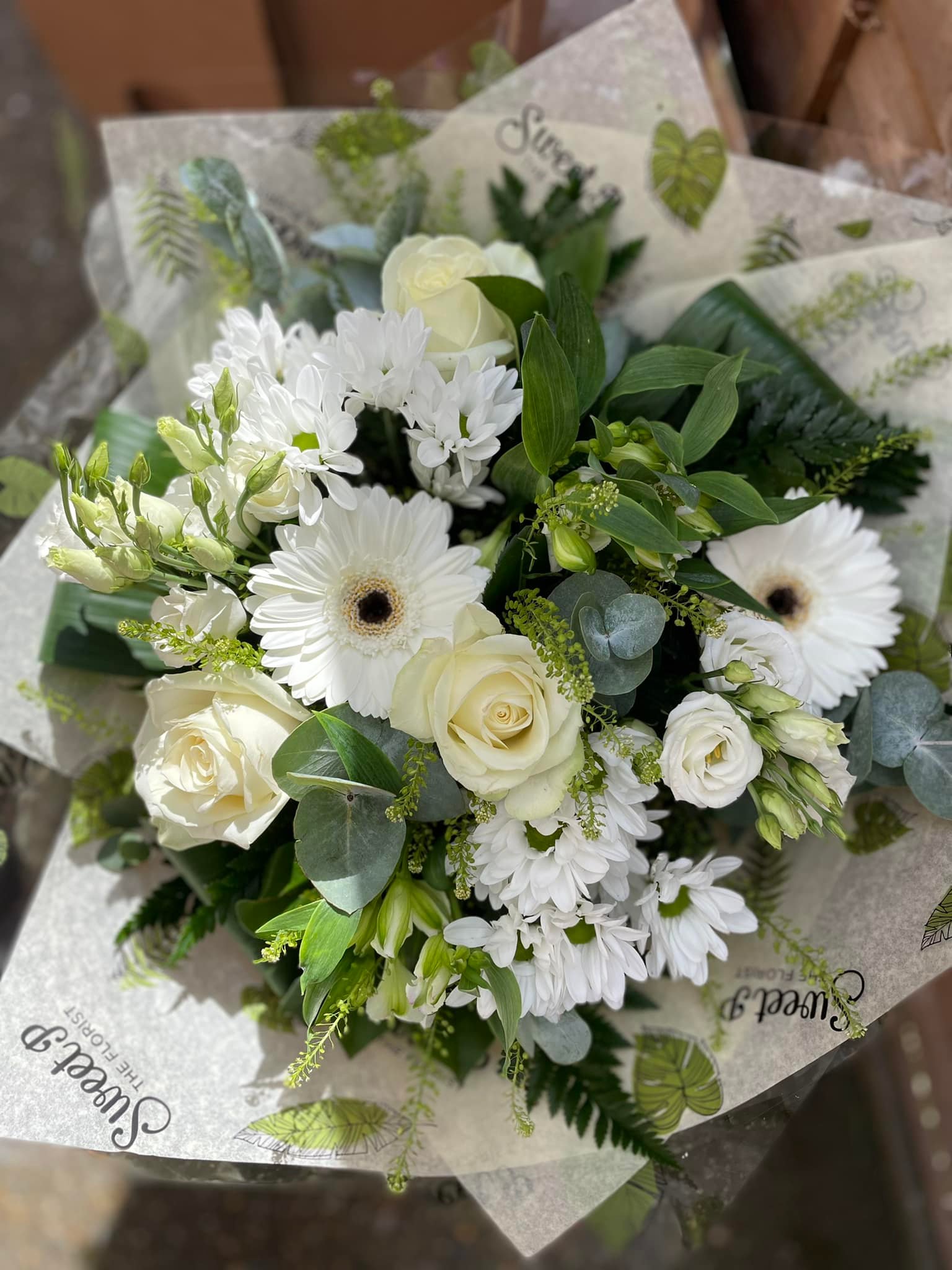 Ian – a mixture of the finest stems in all white shades picked out by our talented florists, and made into a beautiful handtied bouquet in water and displayed in a box