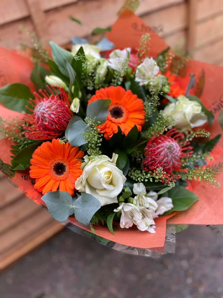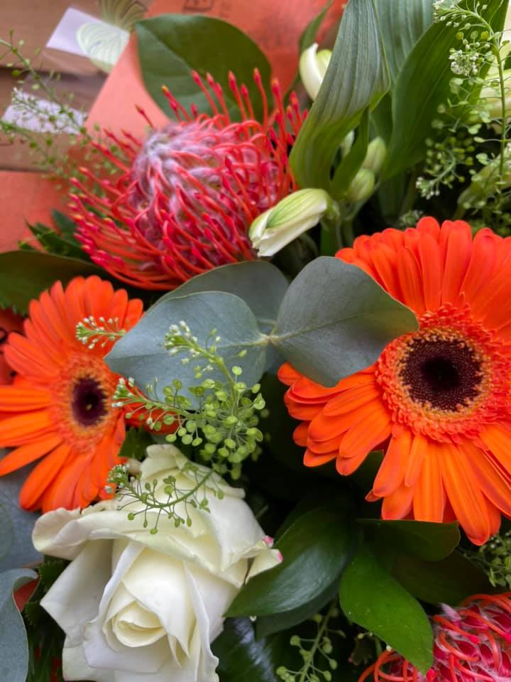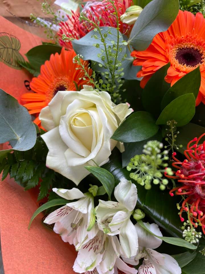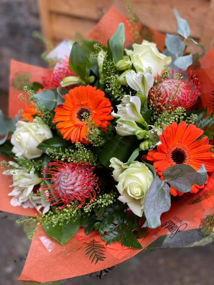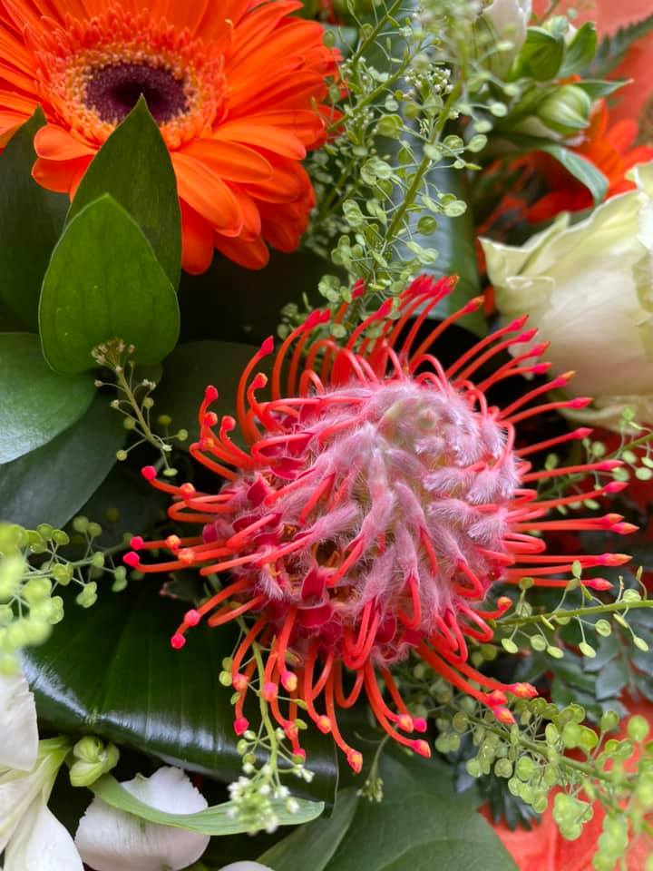 Oscar orange is a zesty little bugger. Consisting of bright orange gerberas and Leucospernum, accompanied with white roses and alstro. Gorgeous, and a little bit unusual