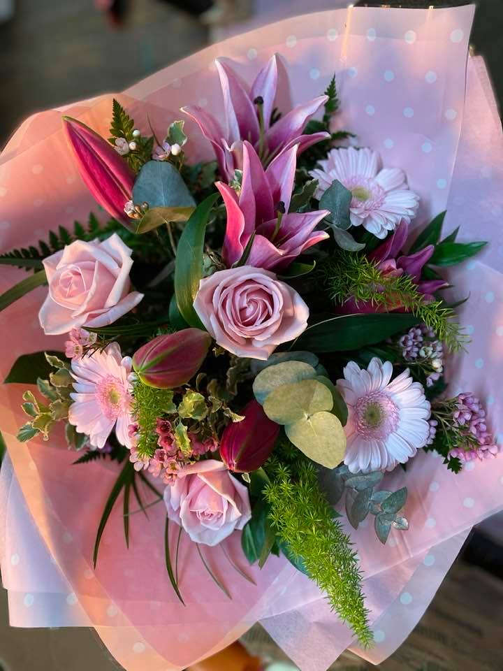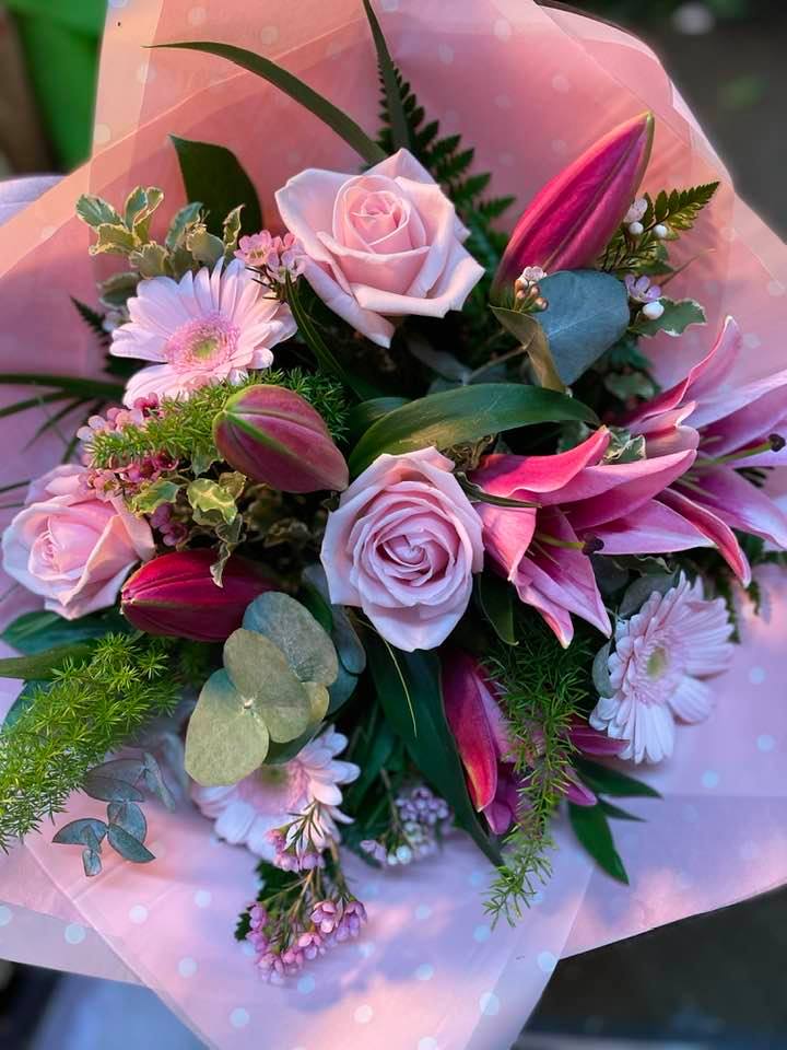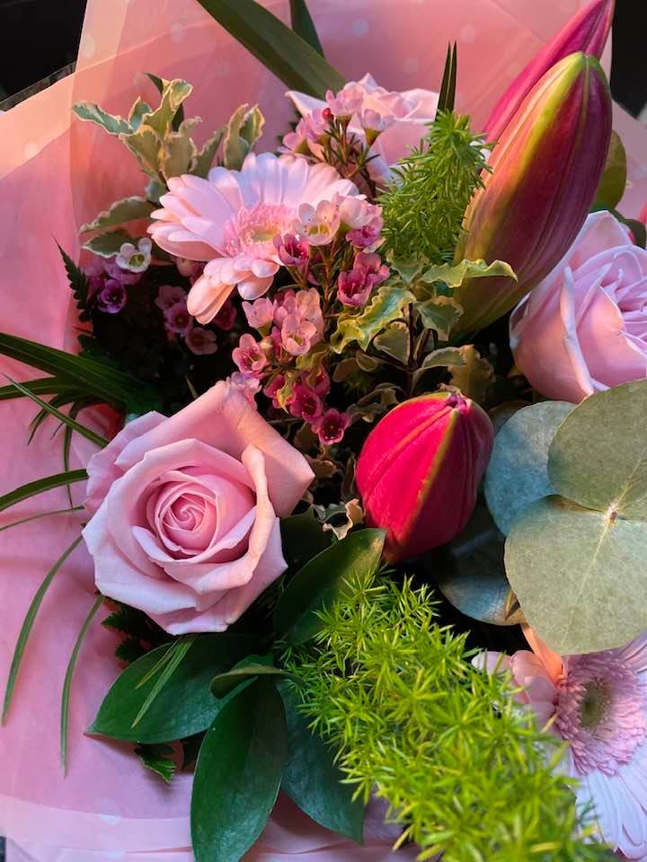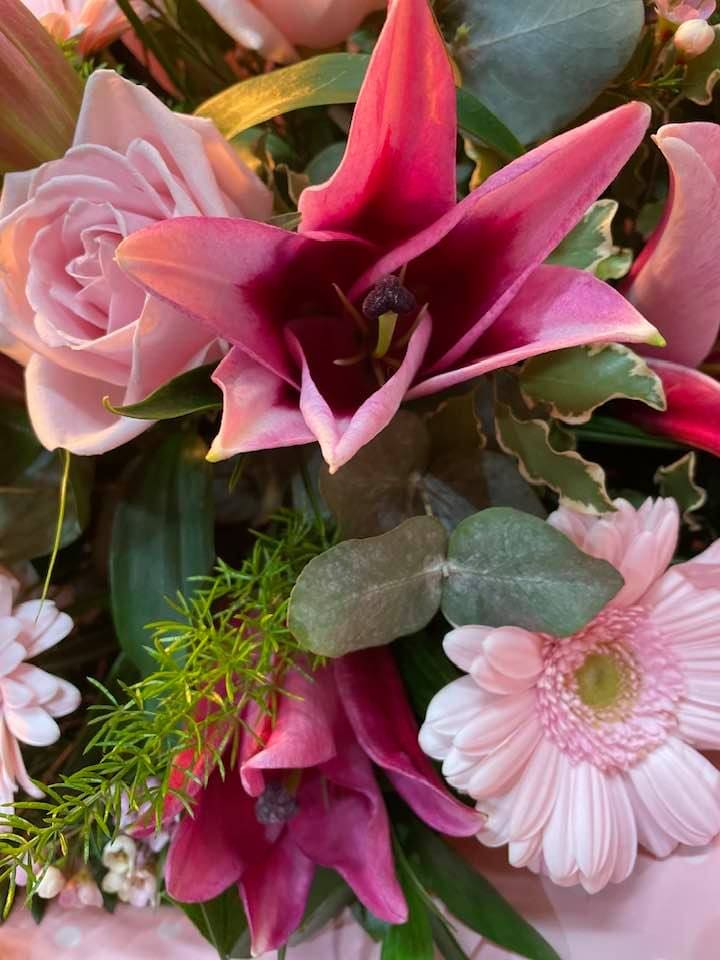 All in pink, roses, lilies gerberas and wax flower. a lovely combination for anyone who’s pink pink pink!