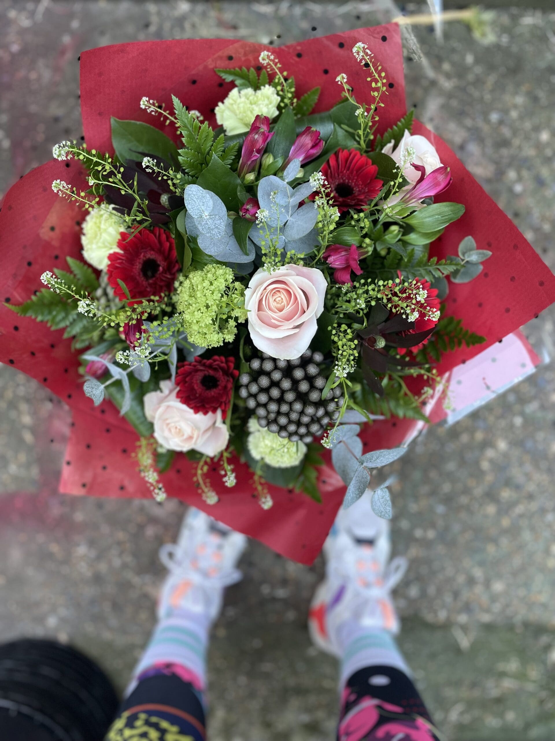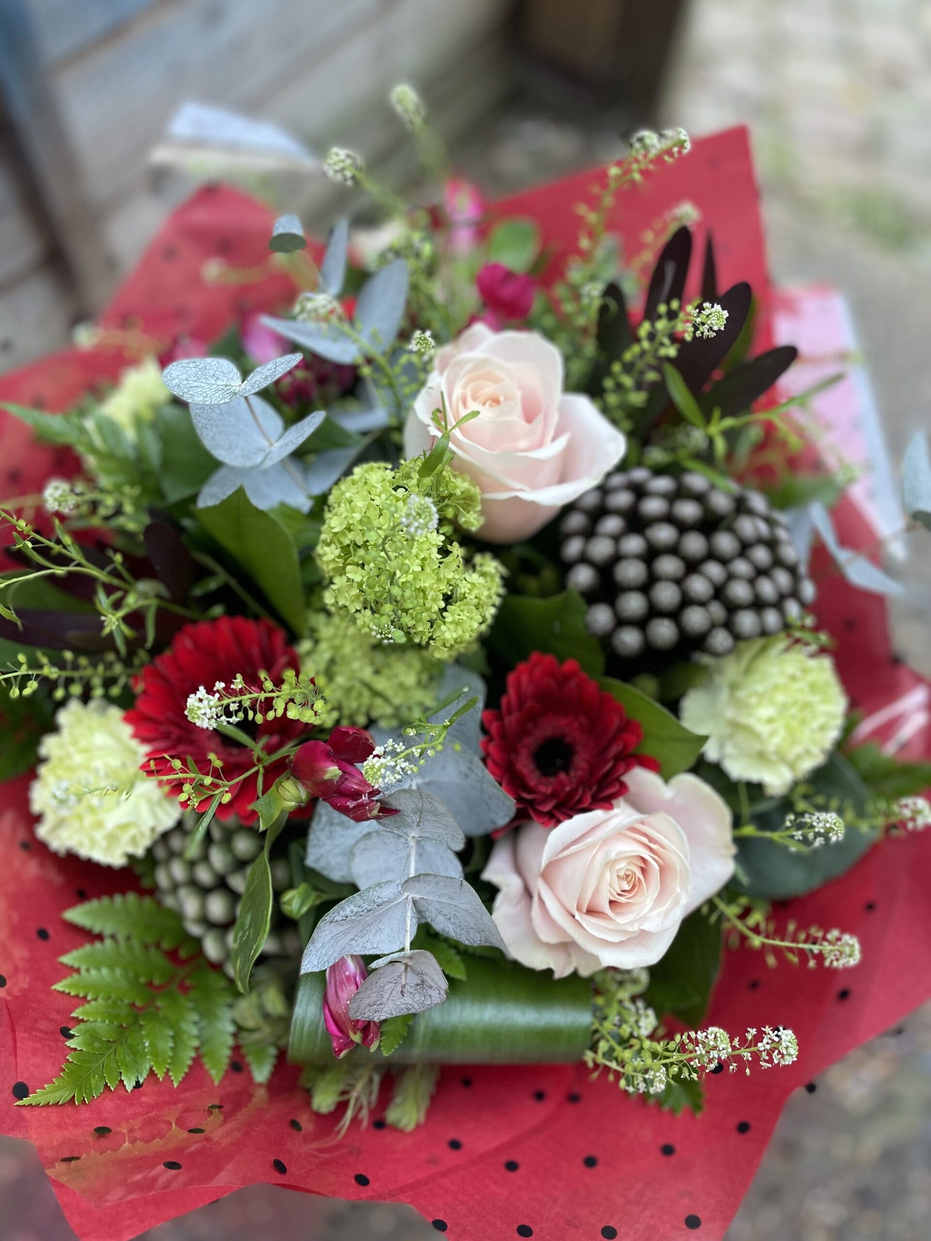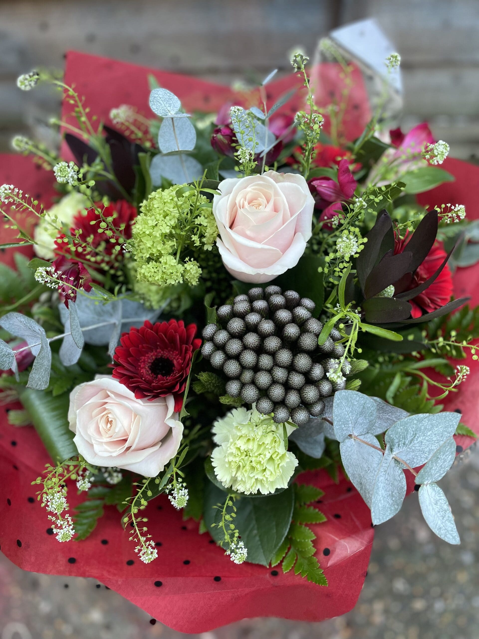 Rich colour combination of red gerberas and alstro, pink roses, brunia and green vibernum and carnations. Great for anyone who likes something a little different! Made by a talented florist at Sweet P, gift wrapped and finished off with a bubble of water and a gift box