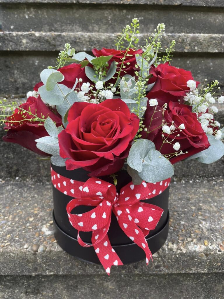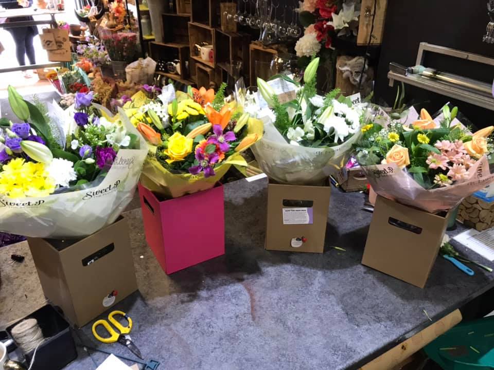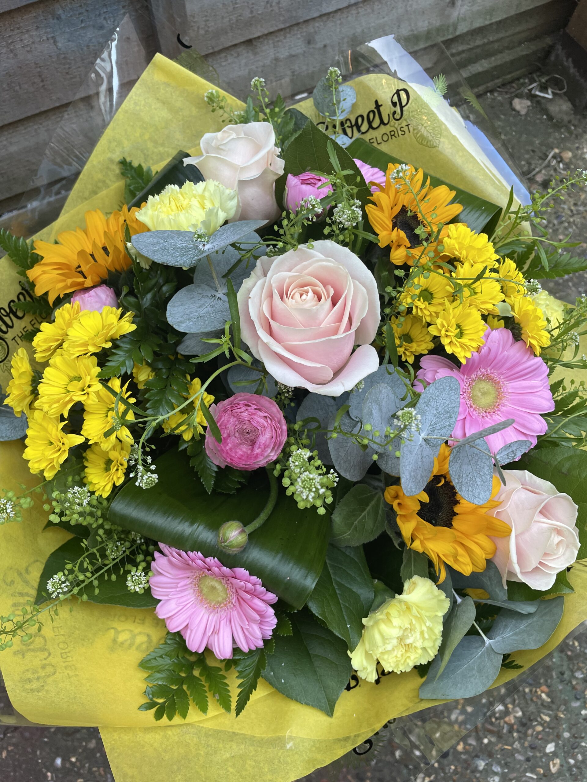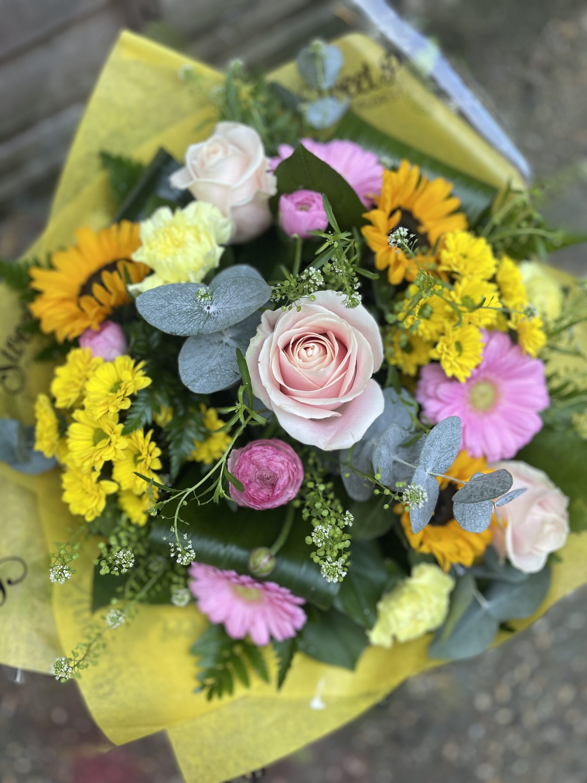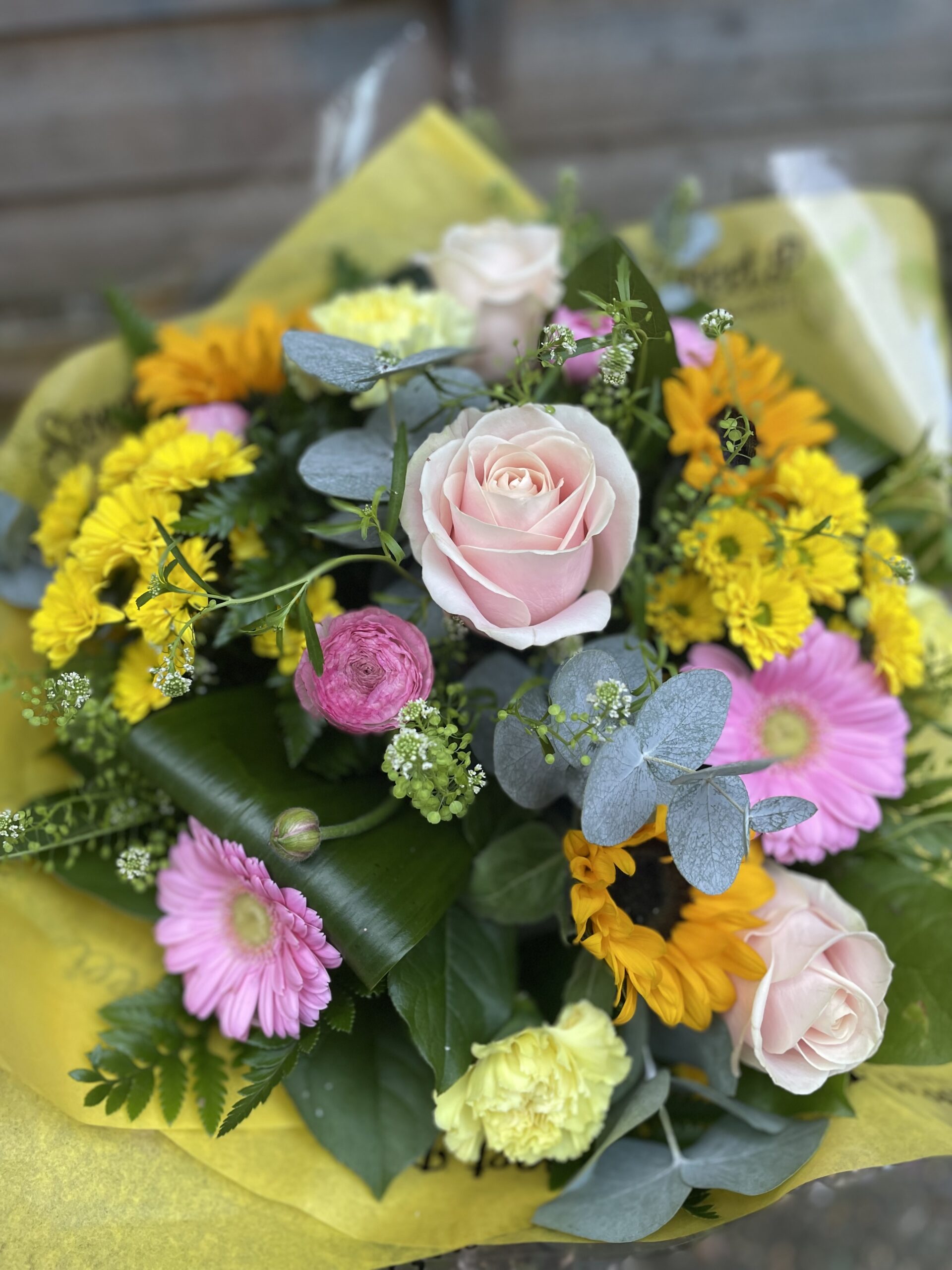 Like blancmange and custard! Soft pinks and yellows using sunflowers, roses, gerberas, carnations, ranunculus and chrysanth. Almost good enough to eat! Gift wrapped and displayed in water and a box