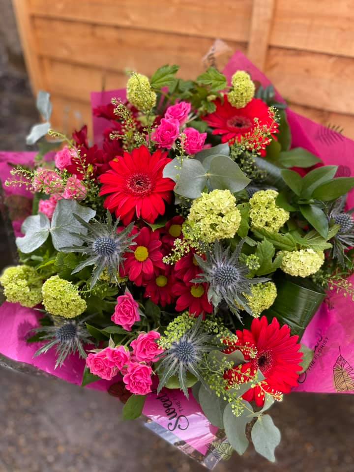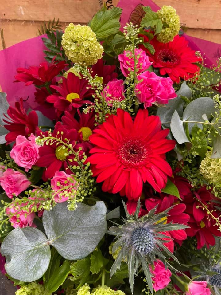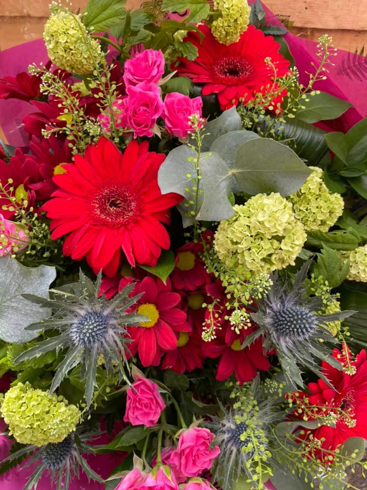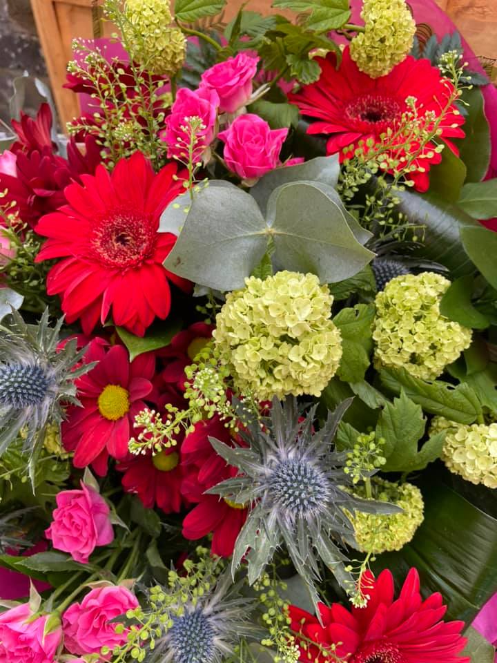 Lime vibernum, red gerberas and xanth, cerise spray rose, and blue thistle make a great mix of interesting blooms in superb colours. (Large is pictured here)
